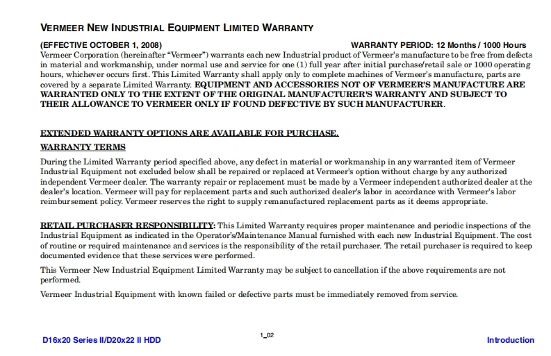 NOTICEThe information contained is for DEALER REFERENCE PURPOSES ONLY.MANUALS ARE MODEL AND SERIAL NUMBER SPECIFIC.If additional printed manuals are required for your shop/office location,order bypart number through the factory's Parts Center.If a retail customer needs replacement manual(s)for a specific unit,contact thefactory's Customer Data Center at:800-829-0051 orcustomerdata@vermeermfg.com