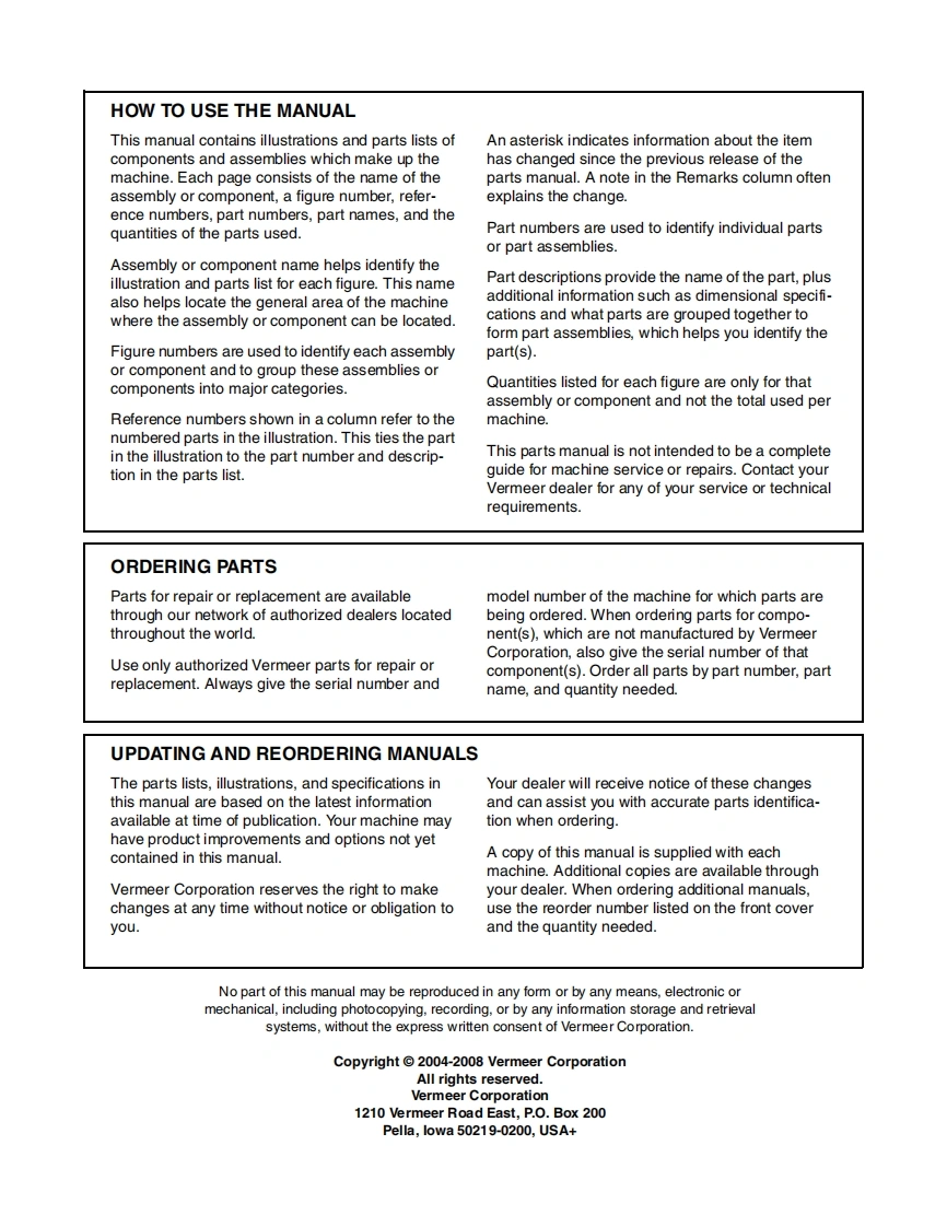 NOTICEThe information contained is for DEALER REFERENCE PURPOSES ONLY.MANUALS ARE MODEL AND SERIAL NUMBER SPECIFIC.If additional printed manuals are required for your shop/office location,order bypart number through the factory's Parts Center.If a retail customer needs replacement manual(s)for a specific unit,contact thefactory's Customer Data Center at:800-829-0051 orcustomerdata@vermeermfg.com