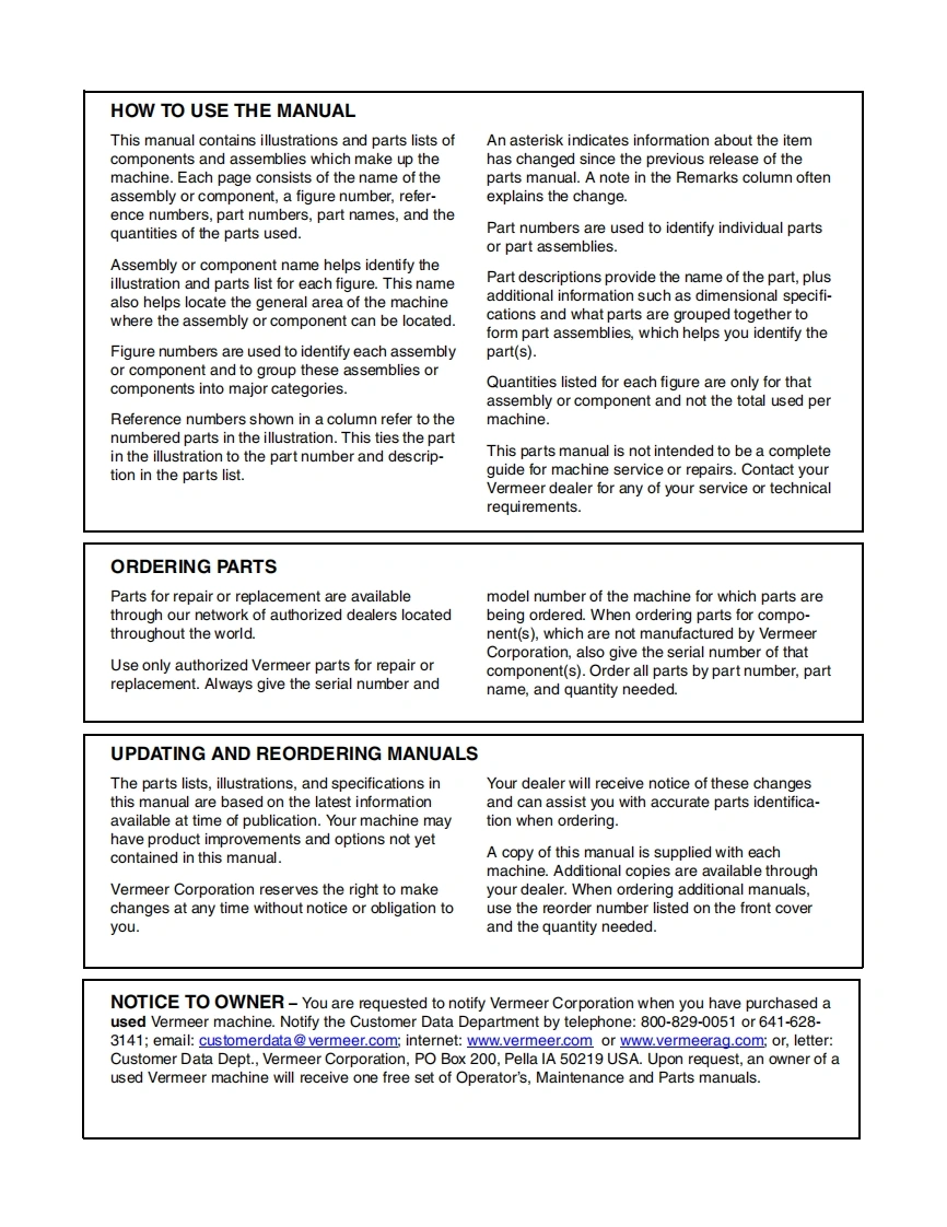 NOTICEThe information contained is for DEALER REFERENCE PURPOSES ONLY.MANUALS ARE MODEL AND SERIAL NUMBER SPECIFIC.If additional printed manuals are required for your shop/office location,order bypart number through the factory's Parts Center.If a retail customer needs replacement manual(s)for a specific unit,contact thefactory's Customer Data Center at:800-829-0051 orcustomerdata@vermeer.com