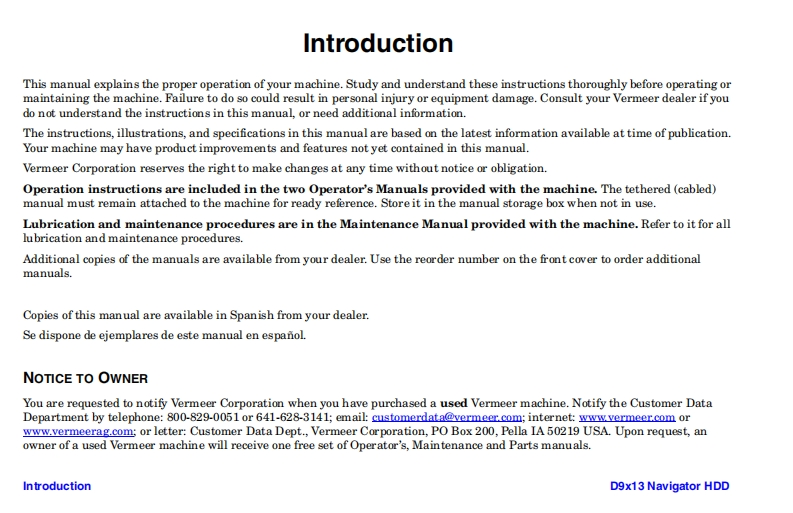 NOTICEThe information contained is for DEALER REFERENCE PURPOSES ONLY.MANUALS ARE MODEL AND SERIAL NUMBER SPECIFIC.If additional printed manuals are required for your shop/office location,order bypart number through the factory's Parts Center.If a retail customer needs replacement manual(s)for a specific unit,contact thefactory's Customer Data Center at:800-829-0051 orcustomerdata@vermeer.com