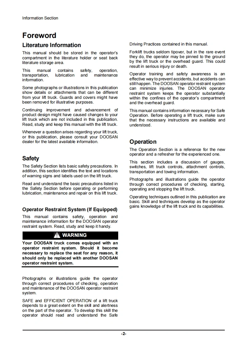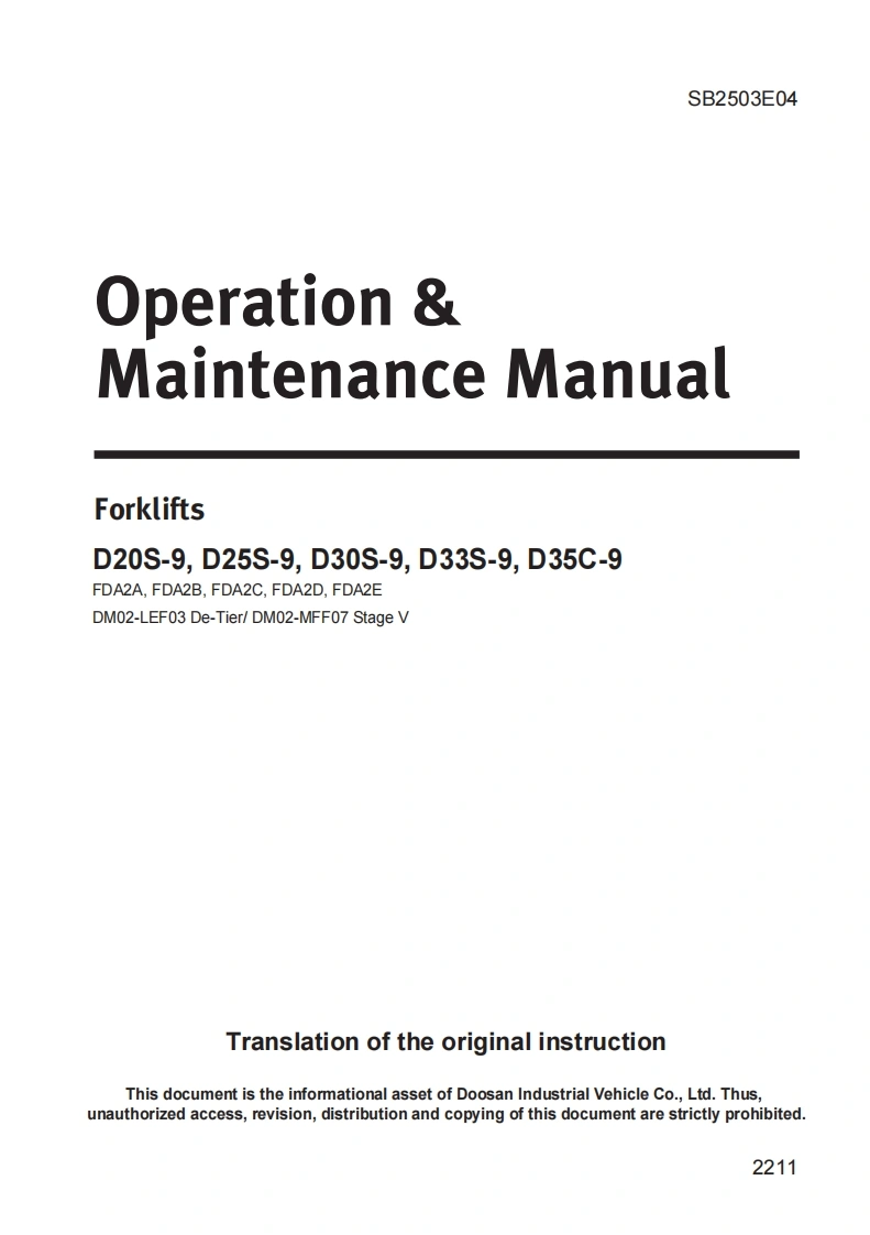 148X210X8.1(H0mm3B2503E04D20S-9DOOSAN12.2022■D25S-9D30S-9D33S-9820253093354.0357gD35C-9OperationMaintenance ManualOperation Maintenance ManualD20S-9,D25S-9,D30S-9,D33S9,D35C-9FDA2A FOA2B,FOA2C.FDA2D.FDAZEDO2-LEF03 De-Tien/DMO2-MFFO7 Stage VDoosan Industrial Vehicle Co.,Ltd.Address 468,Iniung-mo.Deng-gu,hehean,Keread182-32459-10009B2503E04http:W■ww.doo-mForklifts
