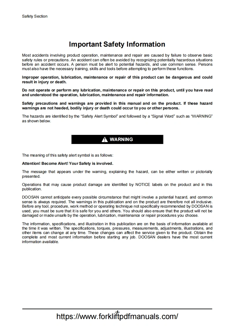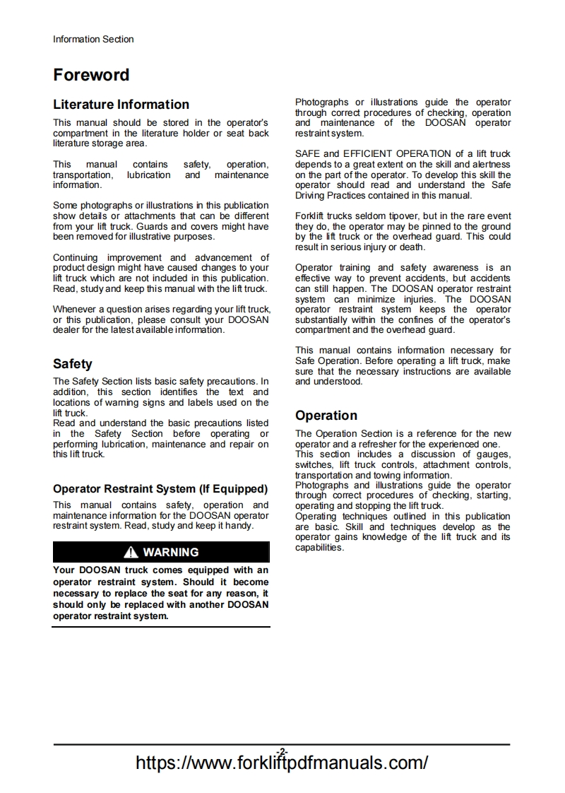 斗山Doosan-D-G-GC-20-25-30-33-35-Forklift-Trucks-Operators-Manual-PDF操作说明书手册找手册网12天前发布关注私信4.53MB210页052斗山Doosan-D-G-GC-20-25-30-33-35-Forklift-Trucks-Operators-Manual-PDF操作说明书手册此内容为付费资源,请付费后查看¥29¥31黄金会员免费钻石会员免费登录购买付费资源 第1页 / 共210页 第2页 / 共210页 第3页 / 共210页 第4页 / 共210页 第5页 / 共210页 第6页 / 共210页 第7页 / 共210页 第8页 / 共210页 第9页 / 共210页 第10页 / 共210页 试读已结束,还剩200页,您可下载完整版后进行离线阅读 THE END中联重科/Doosan/BT 文本预览 SB2349E02OperationMaintenance ManualLIFT TRUCKSD20S5,D25S5,D30S5,D33S5,D35C5G20E5,G25E5,G30E5GC20E-5,GC25E-5,GC30E-5,GC33E-5G20P5,G25P5,G30P5,G33P5,G35C5GC20P-5,GC25P-5,GC30P-5,GC33P-50712https://www.forkliftpdfmanuals.com/ 查看更多 收起部分 喜欢就支持一下吧收藏