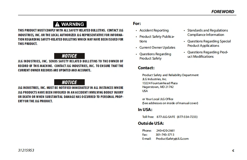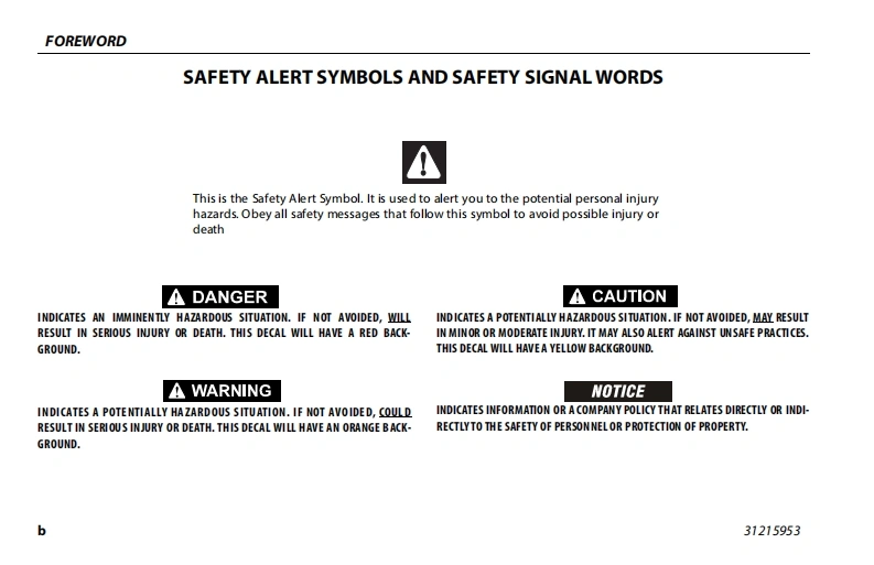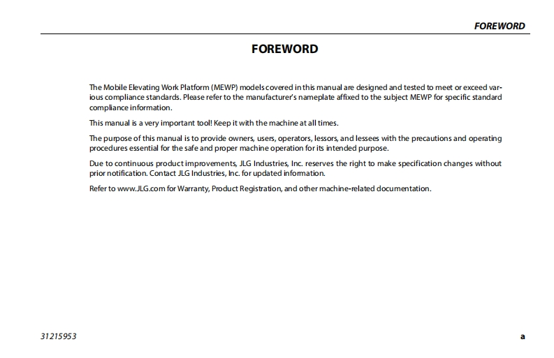 JLG-340AJ-操作说明书手册找手册网3小时前发布关注私信12.57MB132页048JLG-340AJ-操作说明书手册此内容为付费资源,请付费后查看¥29¥31黄金会员免费钻石会员免费立即购买您当前未登录!建议登陆后购买,可保存购买订单付费资源 第1页 / 共132页 第2页 / 共132页 第3页 / 共132页 第4页 / 共132页 第5页 / 共132页 第6页 / 共132页 第7页 / 共132页 第8页 / 共132页 第9页 / 共132页 第10页 / 共132页 试读已结束,还剩122页,您可下载完整版后进行离线阅读 THE ENDJLG/CROWN/Bobcat 文本预览 GAn Oshkosh Corporation CompamyOperation and Safety ManualOriginal Instructions-Keep this manual with the machine at all times.Model340AUPVC2101ANSI C∈©AS/NZS MOL7031215953November 16,2020-RevA 查看更多 收起部分 喜欢就支持一下吧收藏