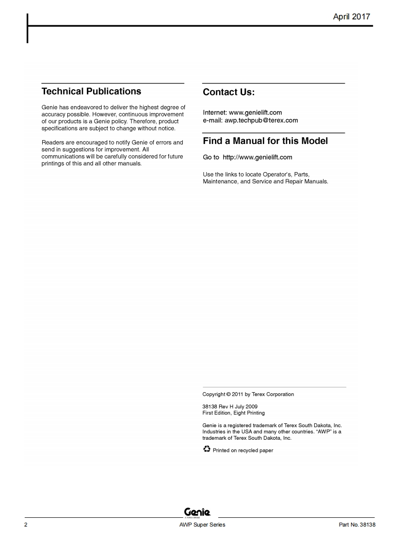 GENIE-AWPSuperSeries_零部件手册找手册网13小时前发布关注私信3.15MB180页029GENIE-AWPSuperSeries_零部件手册此内容为付费资源,请付费后查看¥29¥31黄金会员免费钻石会员免费立即购买您当前未登录!建议登陆后购买,可保存购买订单付费资源 第1页 / 共180页 第2页 / 共180页 第3页 / 共180页 第4页 / 共180页 第5页 / 共180页 第6页 / 共180页 第7页 / 共180页 第8页 / 共180页 第9页 / 共180页 第10页 / 共180页 试读已结束,还剩170页,您可下载完整版后进行离线阅读 THE ENDGenie/Aichi/Wacker 文本预览 GenieA TEREX BRANDParts ManualSerial Number RangeAWP Superfrom SN3896-101to3801-99999Seriesfrom SN AWP02-21194 toAP05-49999Part No.38138Rev H35April 2017 查看更多 收起部分 喜欢就支持一下吧收藏