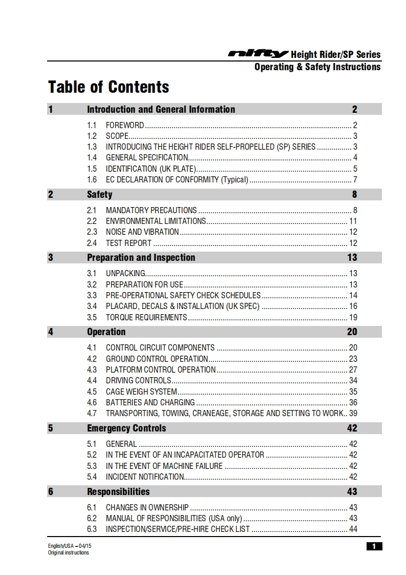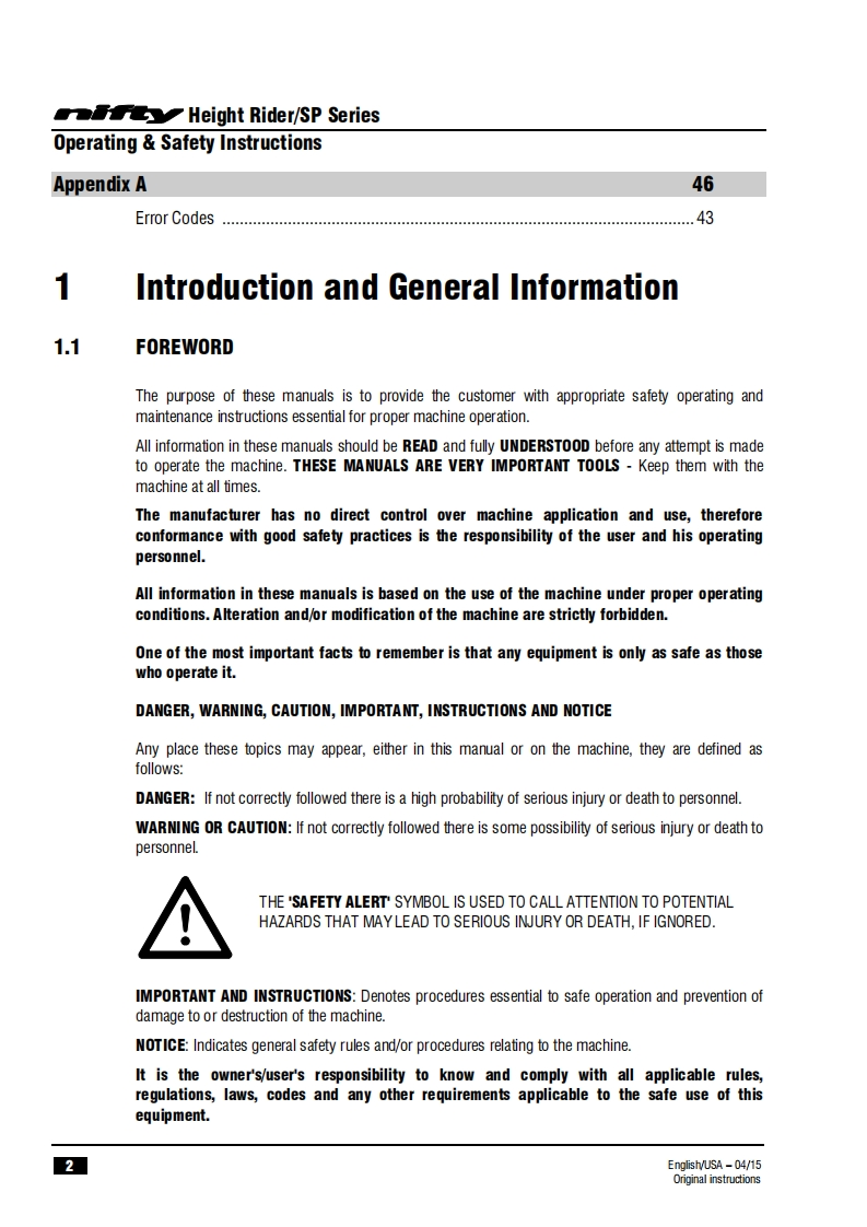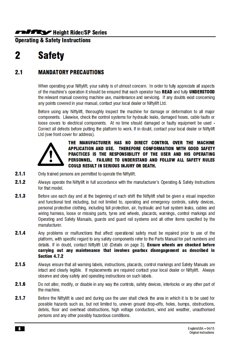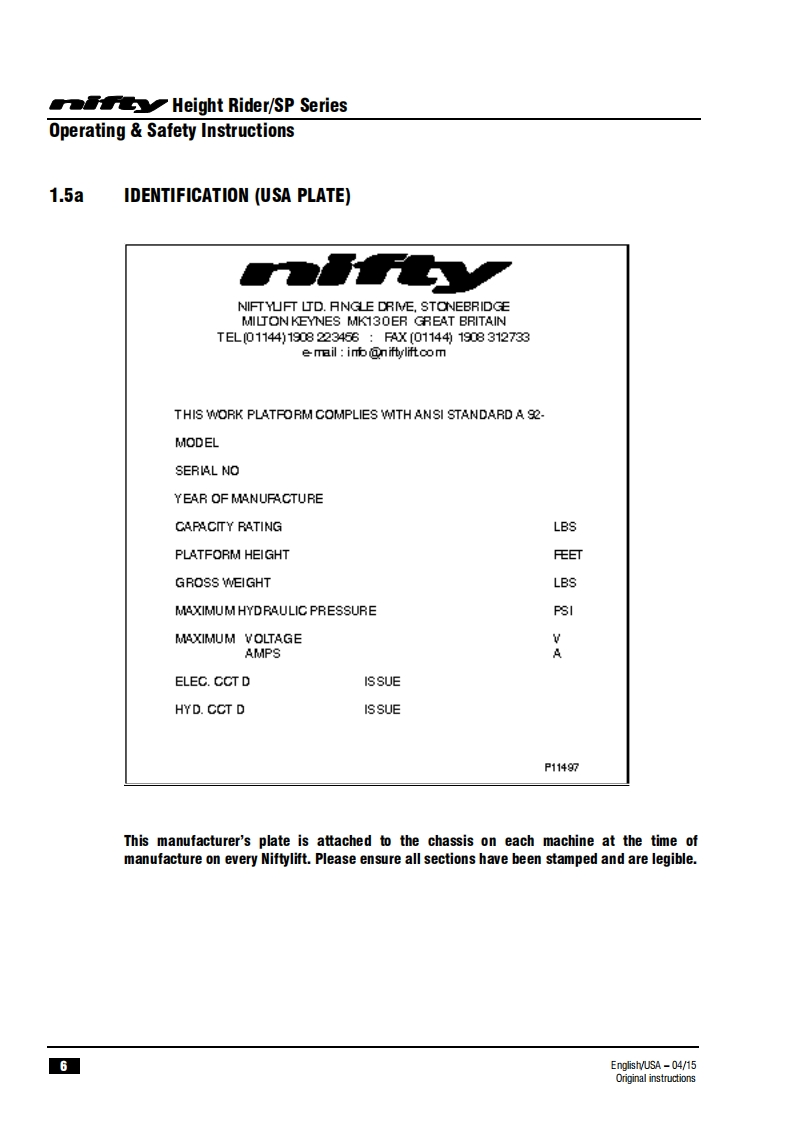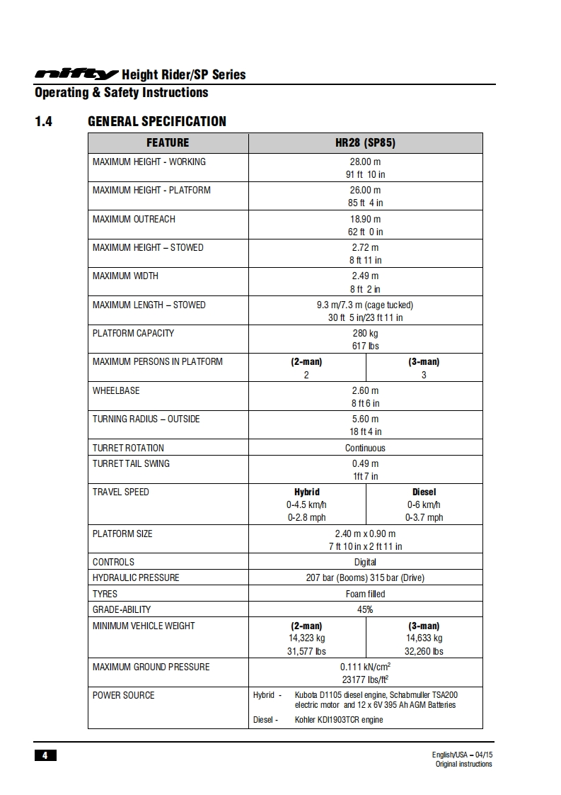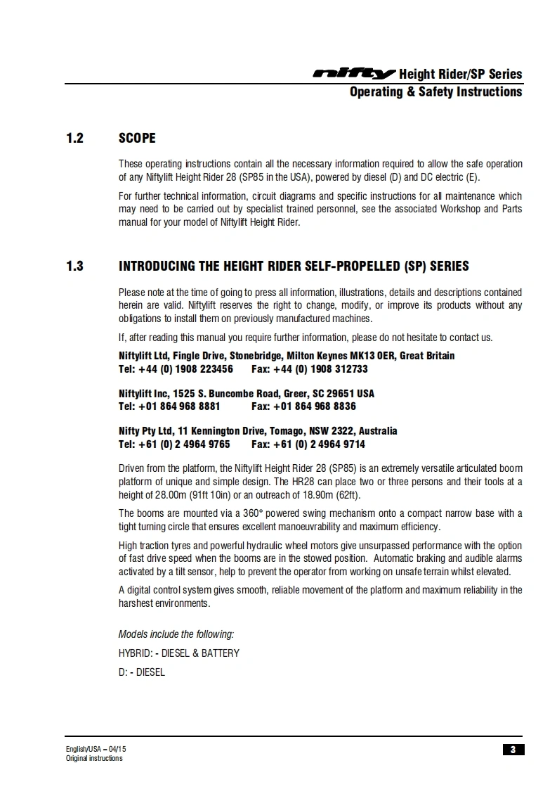司HeightriderOperating safety InstructionsHR28 (SP85)SERIESH7R28wo3Manufactured by:Niftylift LimitedChalkdell DriveShenley WoodMilton KeynesMK5 6GFEnglandwww.niftylift.comnqae-mail:info@niftylift.com1509001Tel:+44(0)1908223456RegisteredM50441/03015Fax+44(0)1908312733