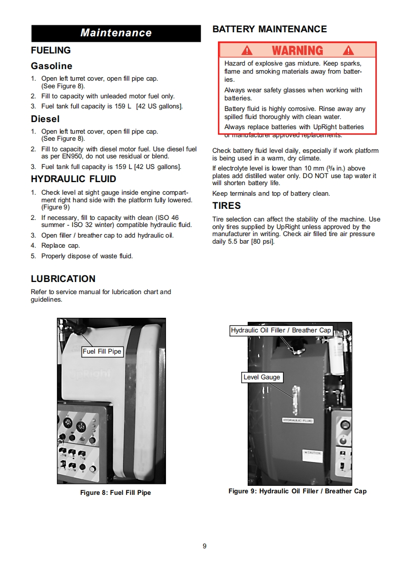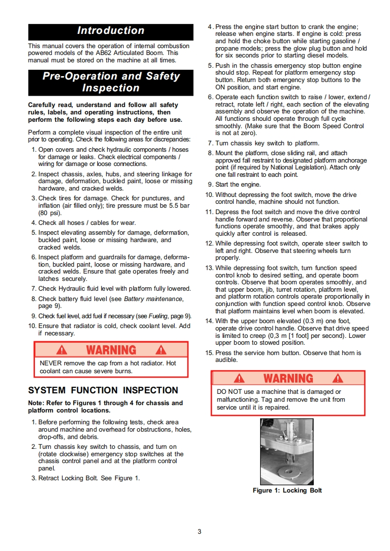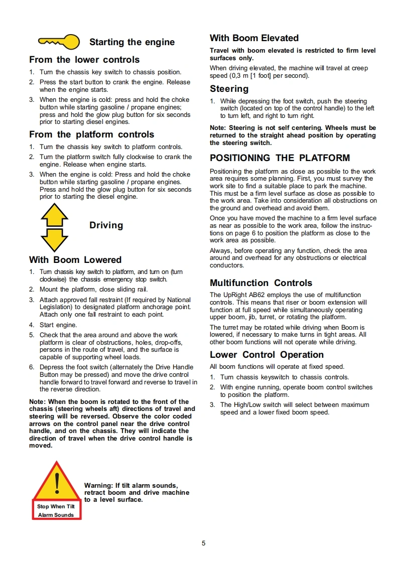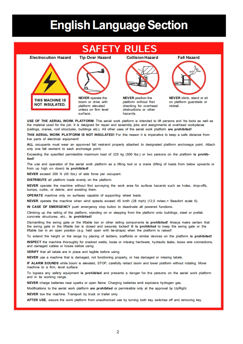 Operator ManualGuide de l'operateurBetriebsanleitungManual del operadorAB62 RTSERIAL NO.1000 TO CURRENTWARNINGAll personnel shall carefully read,understand and follow all safety rules,andoperating instructions before performing maintenance on or operating anyUpRight aerial work platform.Refer to page 2 for the english language version of this Operator Manual.AVERTISSEMENTTout le personnel doit lire attentivement et respecter toutes les consignes desecurite avant d'entretenir ou d'utiliser une plate-forme elevatrice UpRight.Reportez-vous a la page 12 a la section francaise de ce guide de l'operateur.WARNUNGAlle Bediener mussen die Sicherheitsregelungen und die Betriebsanweisungengrundlich durchlesen,verstehen und befolgen,bevor sie Wartungsarbeiten anirgendeiner UpRight Scheren-Hebebuhne vomehmen oder selbige benutzen.Siehe Seite 22 zwecks der deutschsprachigen Ausgabe dieser Betriebsanleitung.ADVERTENCIATodo el personal debe leer atentamente,entender y respetar todas las reglas deseguridad,las instrucciones de operacion antes de efectuar trabajos demantenimiento o manejar cualquier plataforma aerea de trabajo UpRightReferirse a la pagina 32 para la version en espanol de este manual del operador.