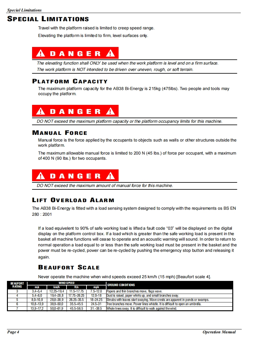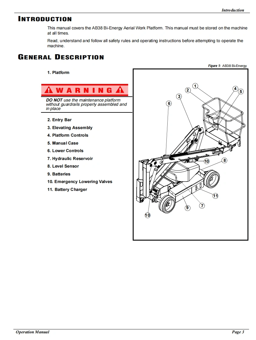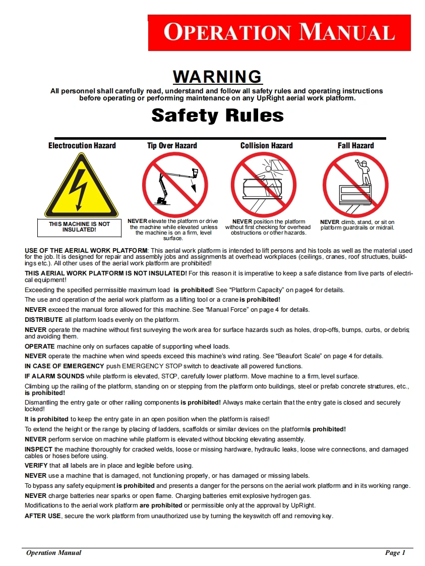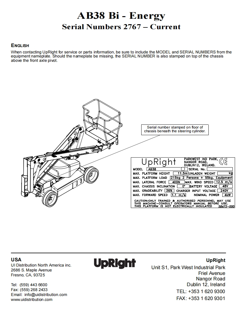 UpRightOperation and PartsManualAB38 BI-ENERGYSERIAL NO.2767 to CurrentWARNINGAll personnel shall carefully read,understand and follow all safety rules,operating instructions,and National Safety Instructions/Requirementsbefore operating or performing maintenance on any UpRight Aerial WorkPlatform.p1n:502513-000