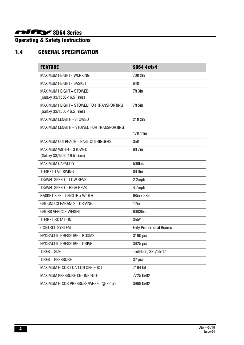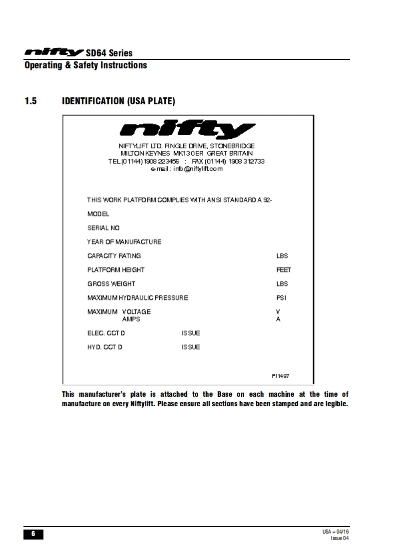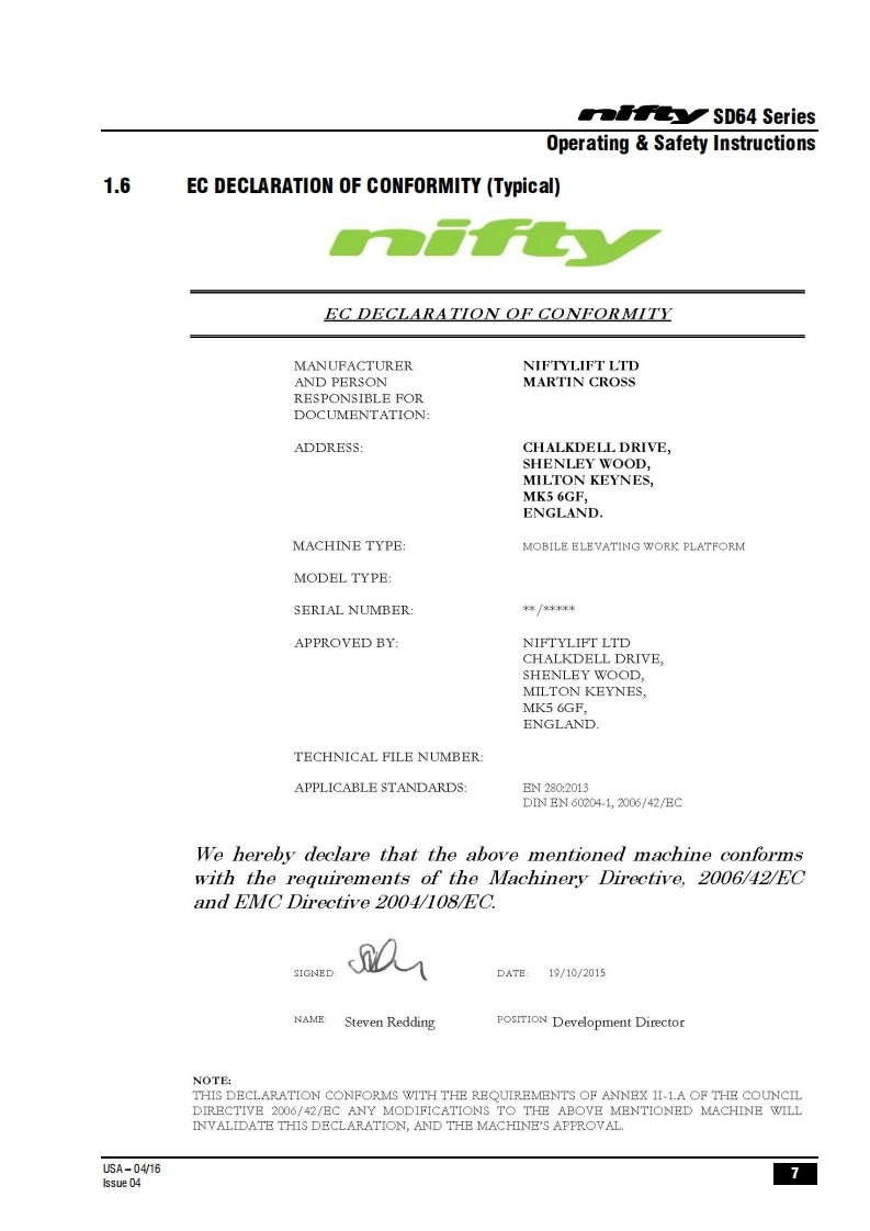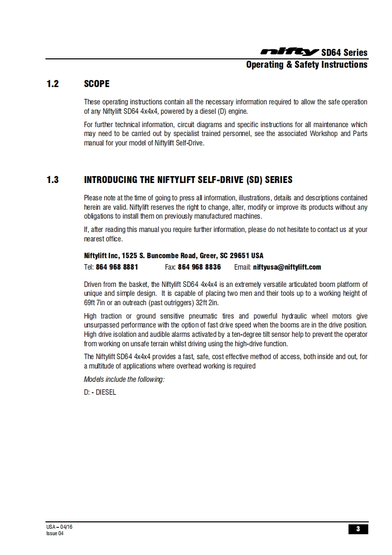 FauSD64Operating Safety InstructionsMODEL SD64 SERIESSD64D000y4x4x4Niftylift Limited1525 S.Buncombe RoadGreerSC29651USA忠www.niftylift.comnqa.e-mail:niftyusa@niftylift.comIs09001Tel864-968-8881RegisteredM50407/04015Fax864-968-8836