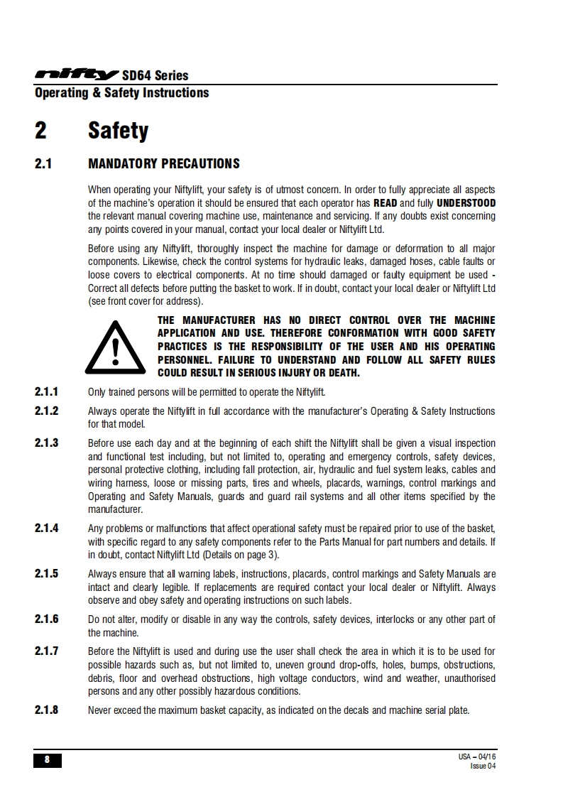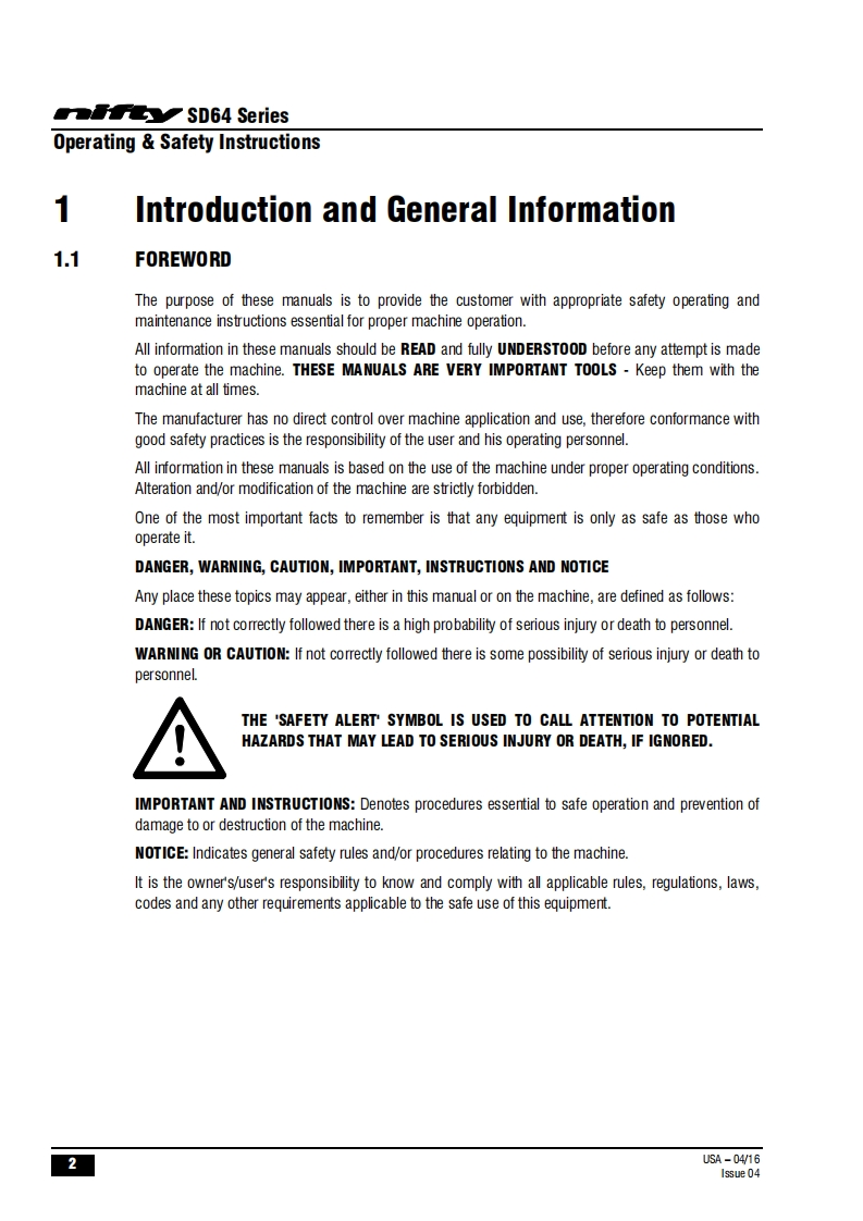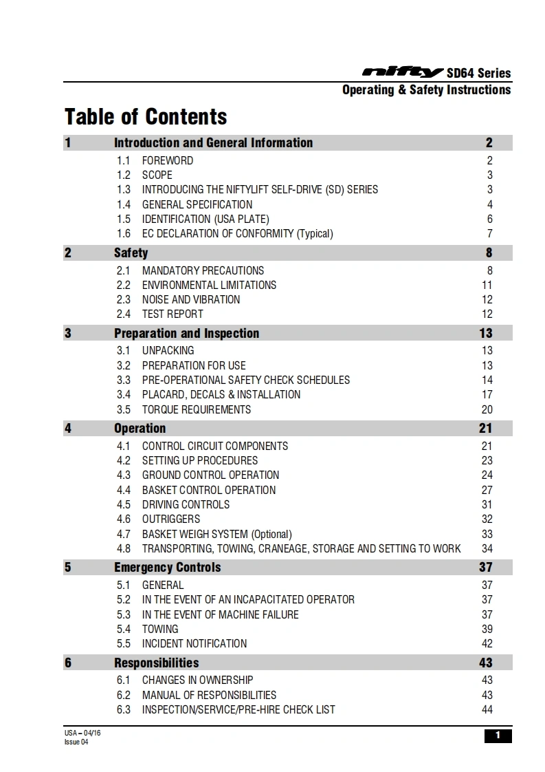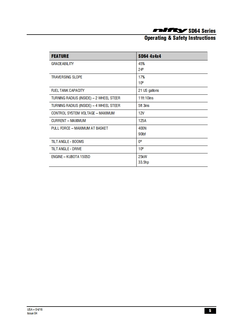 FauSD64Operating Safety InstructionsMODEL SD64 SERIESSD64D000y4x4x4Niftylift Limited1525 S.Buncombe RoadGreerSC29651USA忠www.niftylift.comnqa.e-mail:niftyusa@niftylift.comIs09001Tel864-968-8881RegisteredM50407/04015Fax864-968-8836