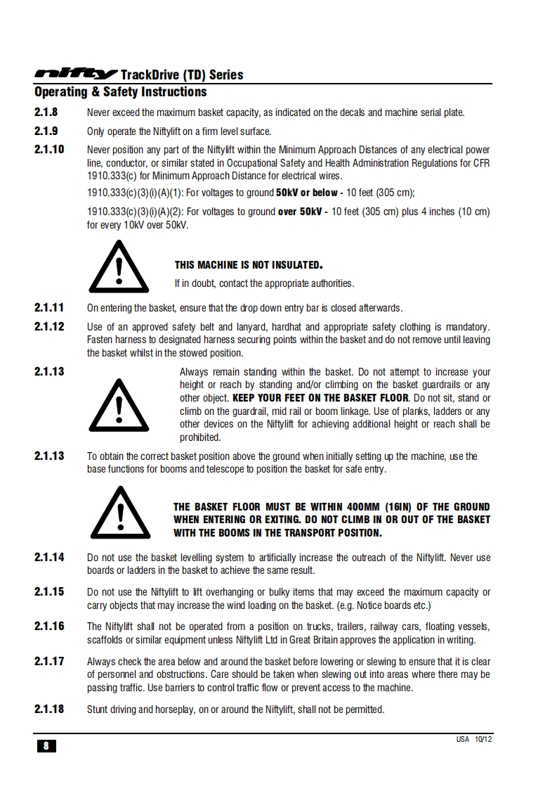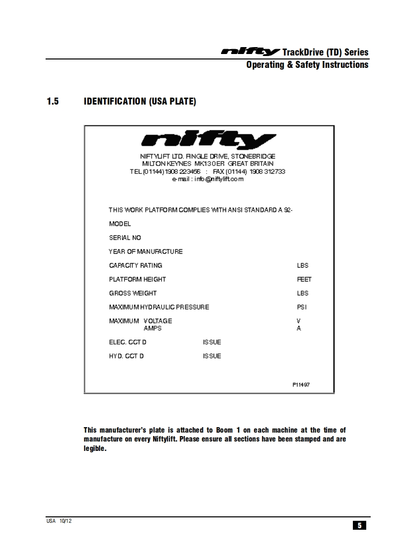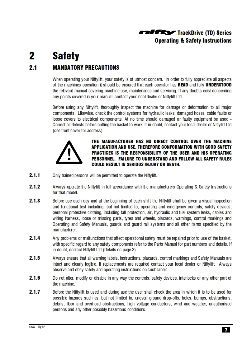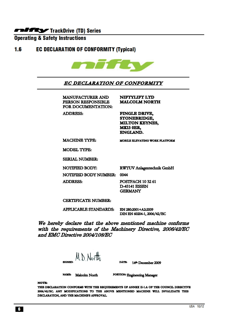 NIFTY-TD34TN_操作说明书手册找手册网3小时前发布关注私信1.02MB40页045NIFTY-TD34TN_操作说明书手册此内容为付费资源,请付费后查看¥29¥31黄金会员免费钻石会员免费立即购买您当前未登录!建议登陆后购买,可保存购买订单付费资源 第1页 / 共40页 第2页 / 共40页 第3页 / 共40页 第4页 / 共40页 第5页 / 共40页 第6页 / 共40页 第7页 / 共40页 第8页 / 共40页 第9页 / 共40页 第10页 / 共40页 试读已结束,还剩30页,您可下载完整版后进行离线阅读 THE END徐工/玉柴/Nifty 文本预览 TrackDriveOperating Safety InstructionsMODEL TD34TN SERIEST34TW®Niftylift Limited1525 S.Buncombe RoadGreerSC29651USAwww.niftylift.comnqa.e-mail:niftyusa@niftylift.com1509001Tel:864-968-8881RegisteredM50411/02015Fax864-968-8836 查看更多 收起部分 喜欢就支持一下吧收藏