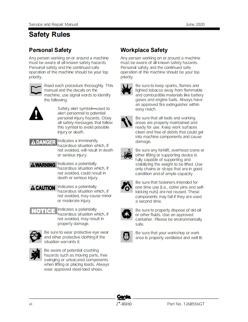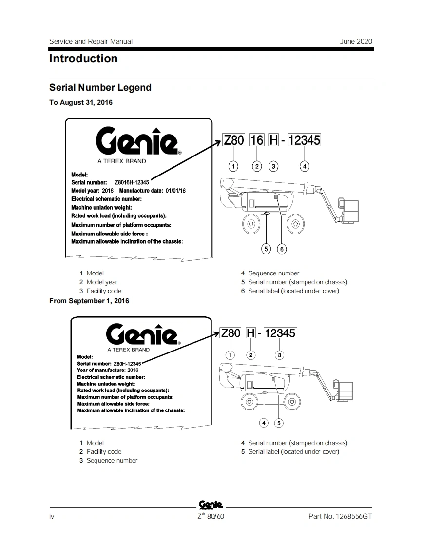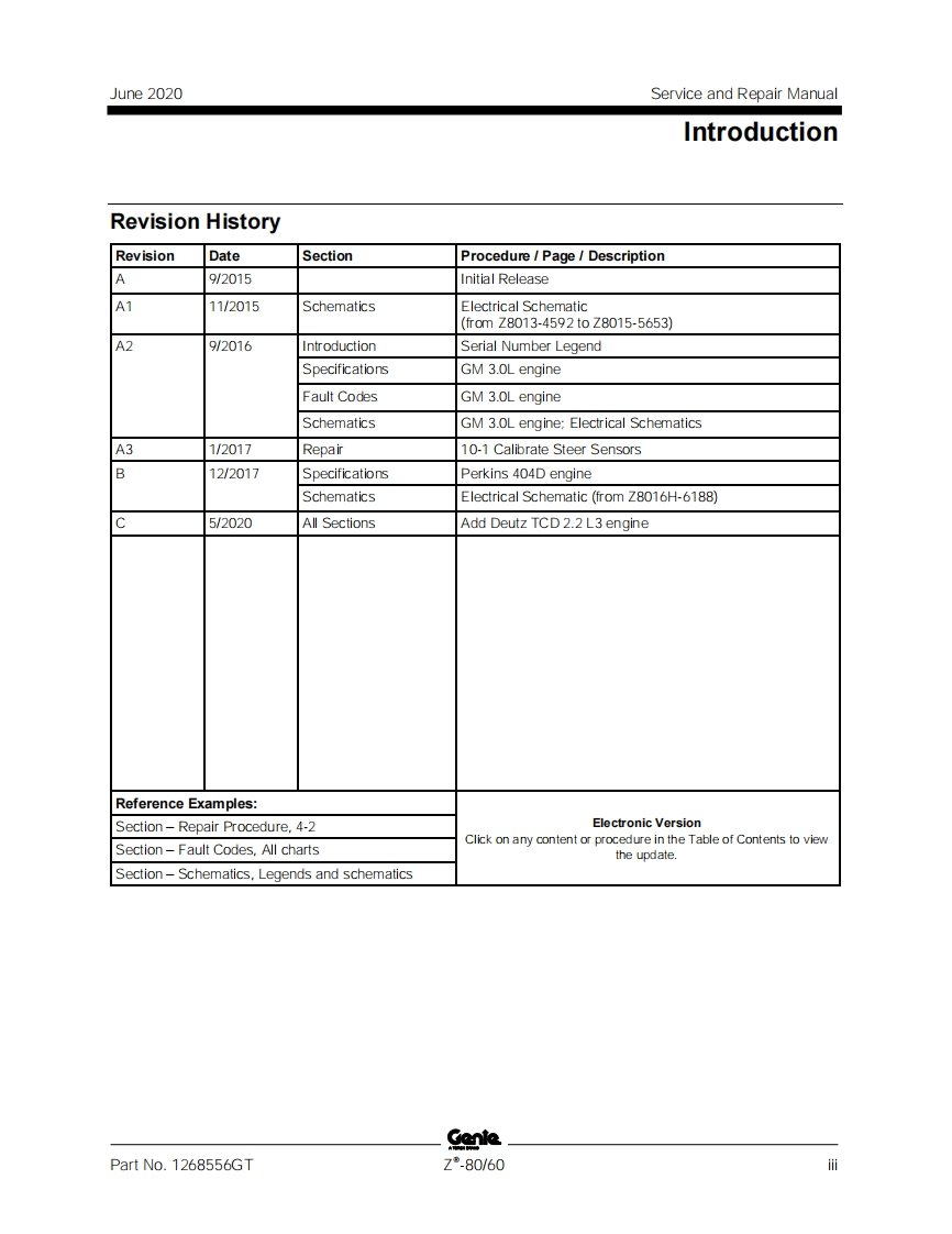 GenieA TEREX BRANDService and Repair ManualSerial Number Rangefrom Z8013-4592Z®-80/60toZ8016H-6399This manual includes:from Z80H-6400Repair proceduresFault CodesElectrical andHydraulic SchematicsFor detailed maintenanceprocedures,refer to theappropriate MaintenanceManual for your machine.Part No.1268556GTRev CJune 2020