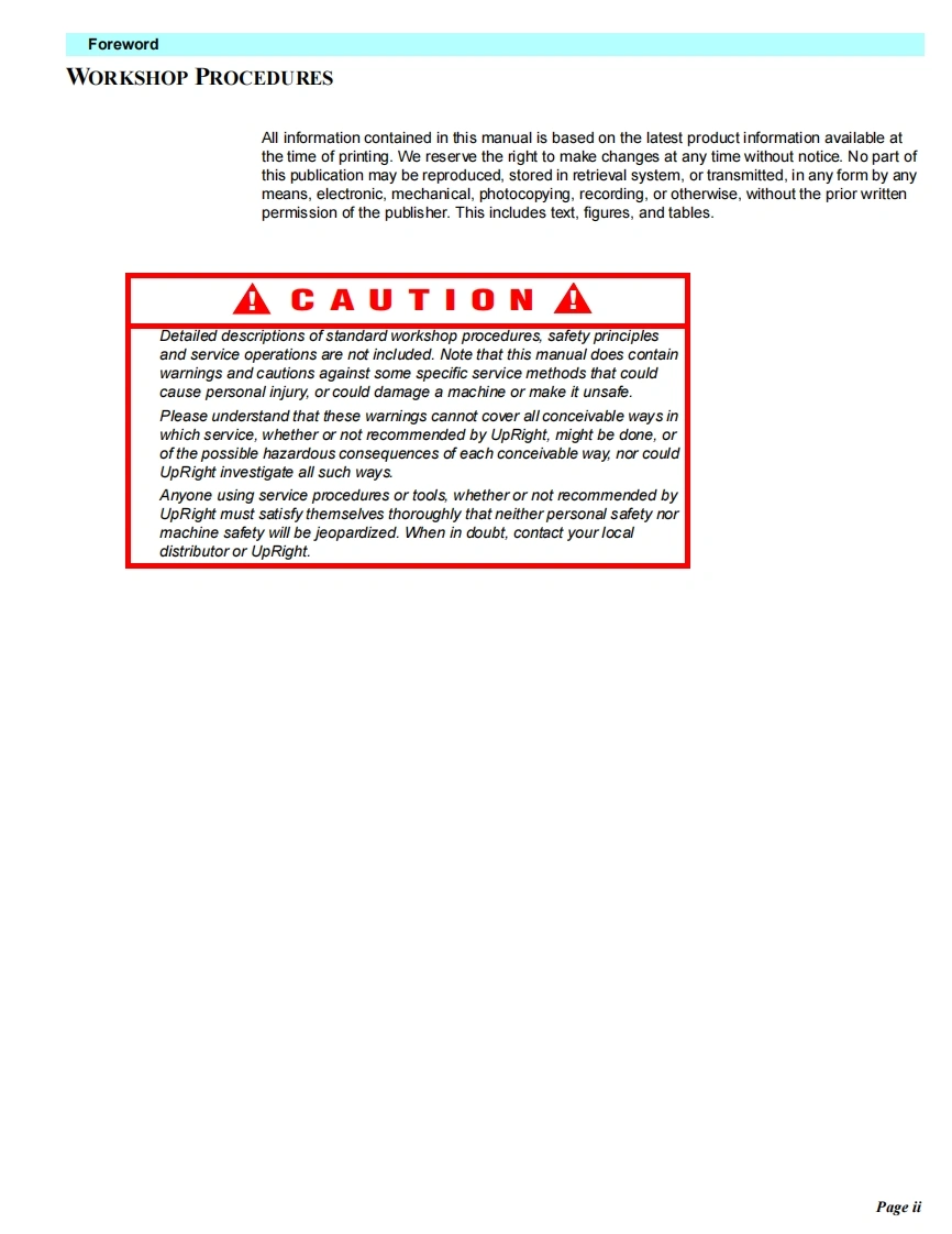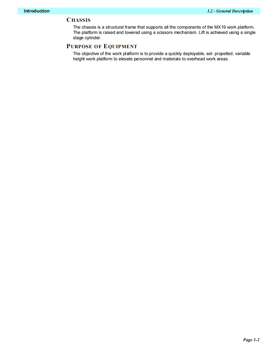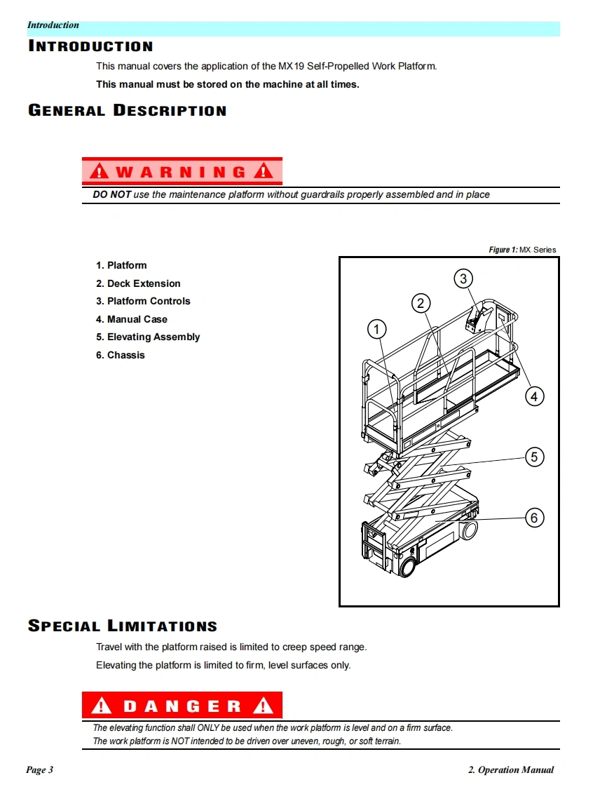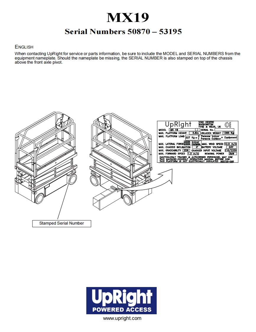 UpRightPOWERED ACCESSWARNINGThe MX19 Machine has been re-assessed to ensurecompliance to the Machinery Directive (2006/42/EC).The Machine rating has been changed from:Windspeed rating of 12.5 m/s(Beaufort 6)ToWindspeed rating of 7 m/s(Beaufort 4)Please attach to the front cover ofyour MX19 manual510328-000MX19WORK PLATFORM