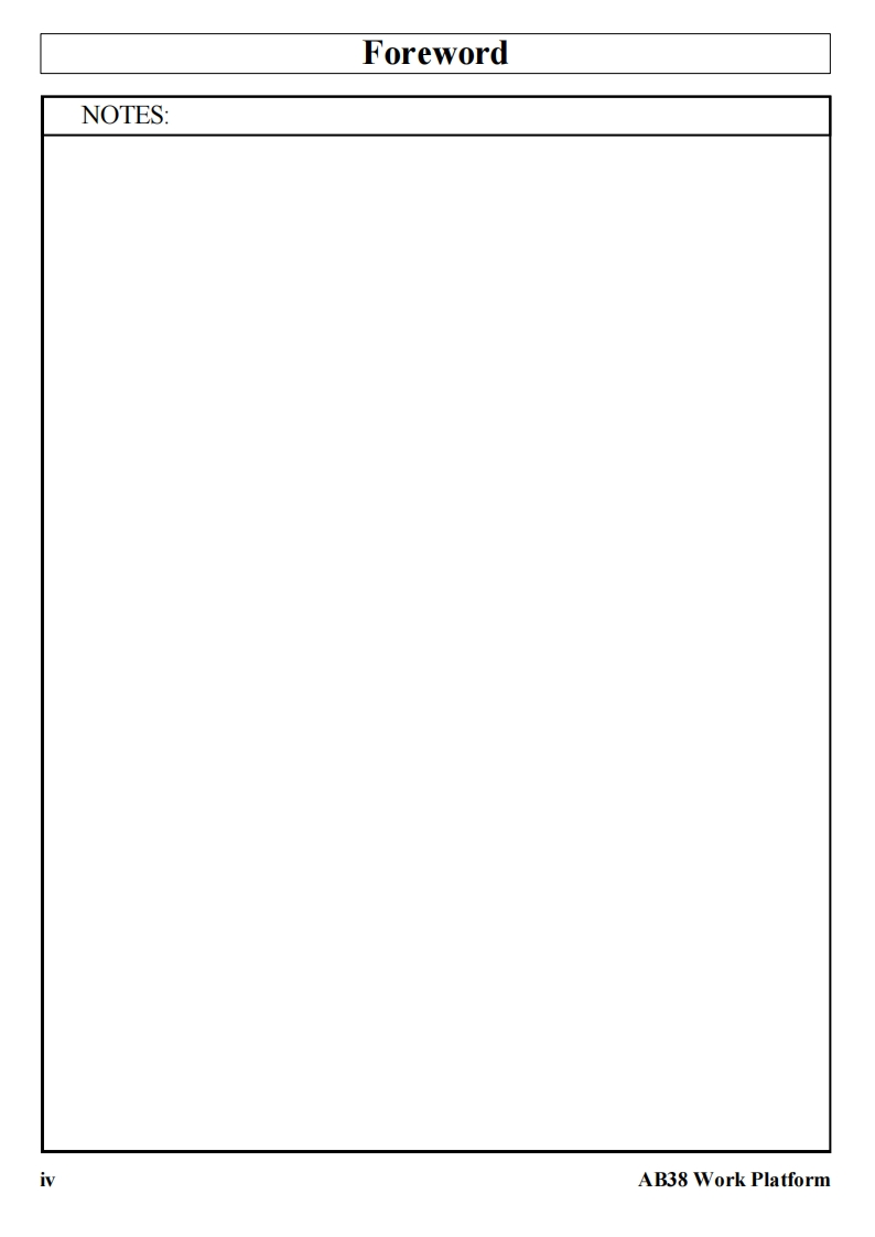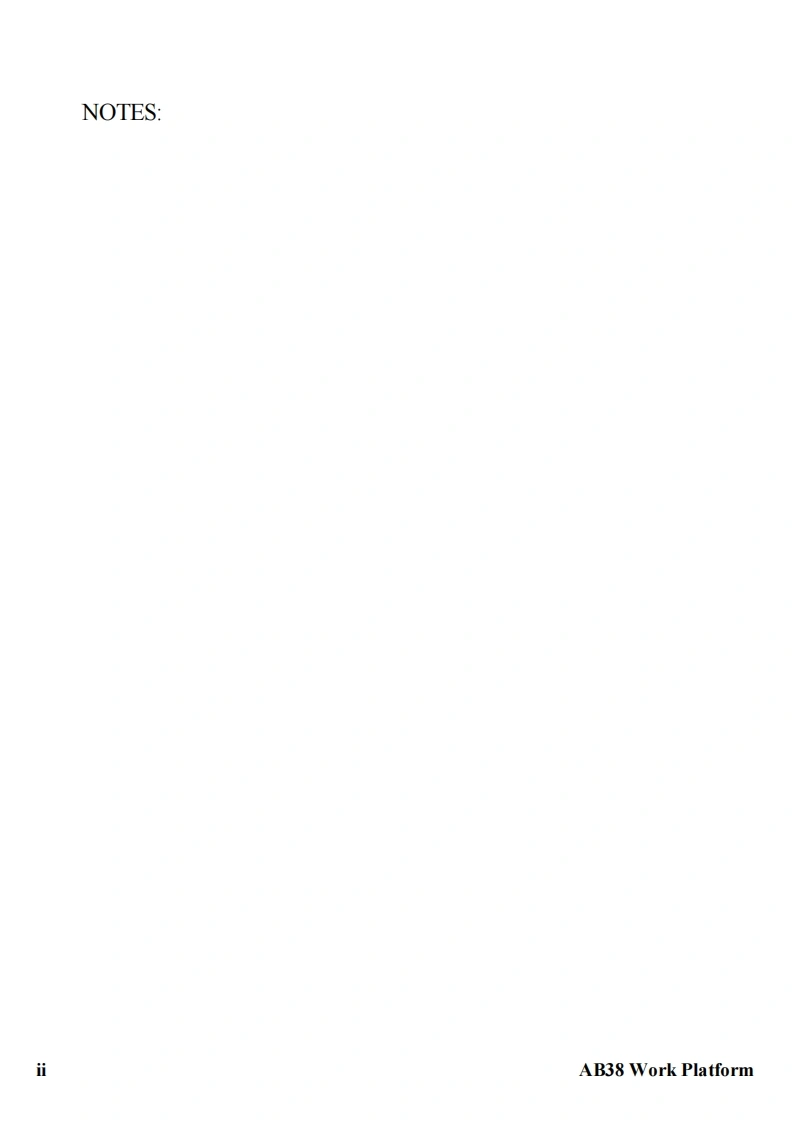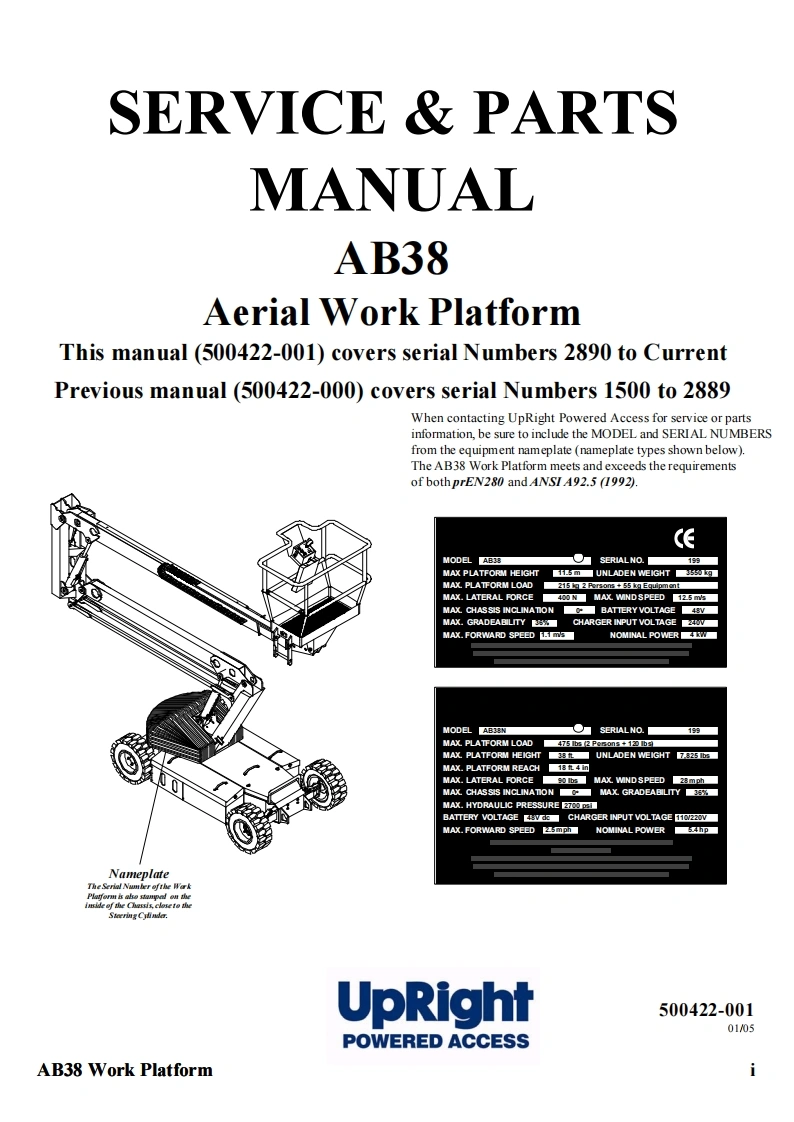 UpRightPOWERED ACCESSWARNINGThe AB38N Machine has been re-assessed to ensurecompliance to the Machinery Directive (2006/42/EC).The Machine rating has been changed from:2 People Indoors and Outdoors.To2 People Indoors and 1 Person Outdoors.Please attach to the front cover ofyour manualAB38WORK PLATFORM