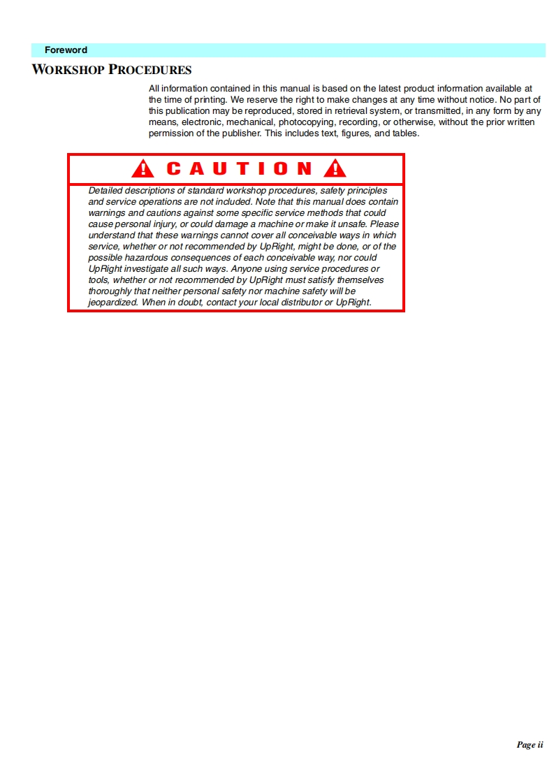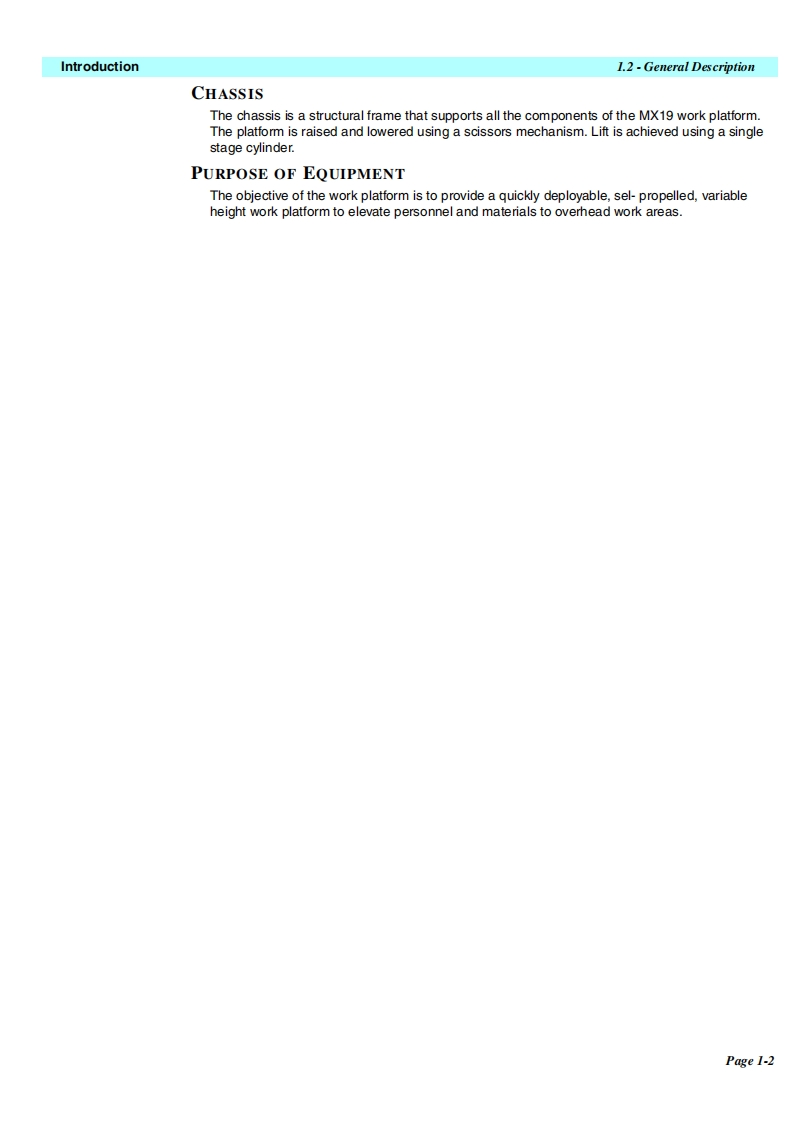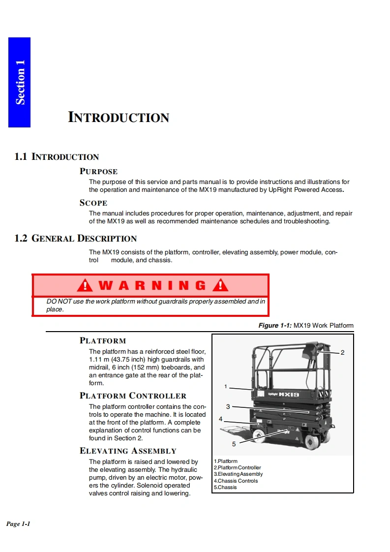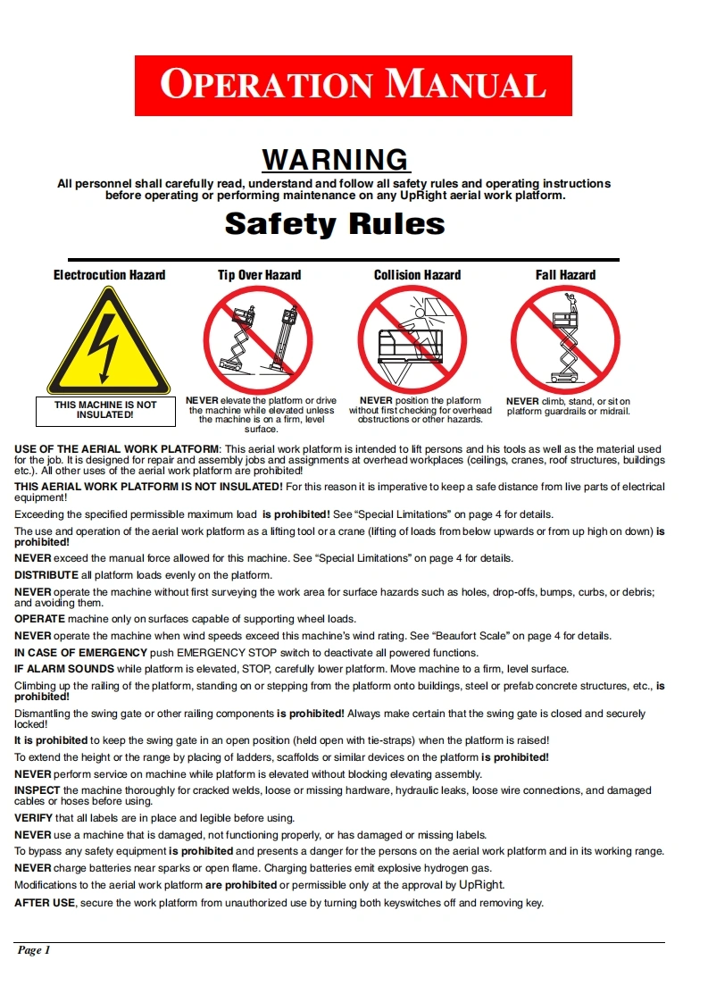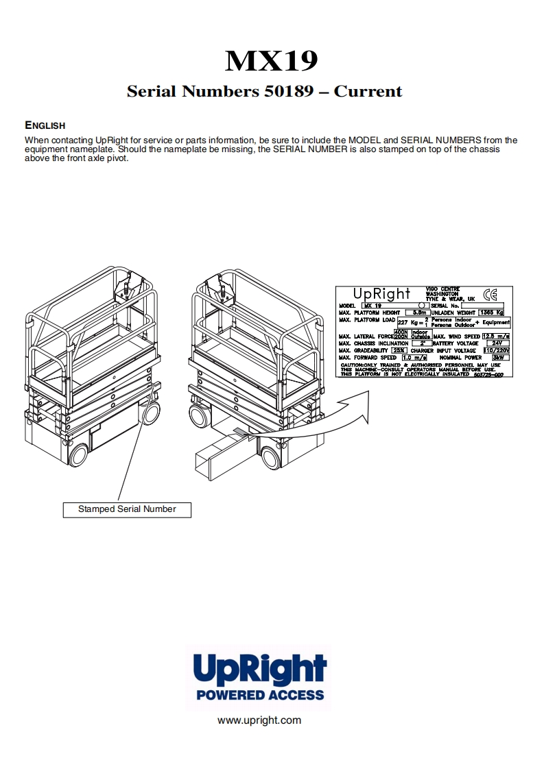UpRightPOWERED ACCESSWARNINGThe MX19 Machine has been re-assessed to ensurecompliance to the Machinery Directive(2006/42/EC).The Machine rating has been changed from:Windspeed rating of 12.5 m/s(Beaufort 6)ToWindspeed rating of 7 m/s (Beaufort 4)Please attach to the front cover ofyour MX19 manual510328-000MX19WORK PLATFORM