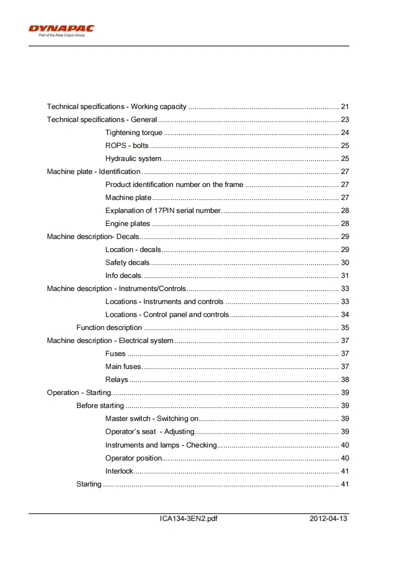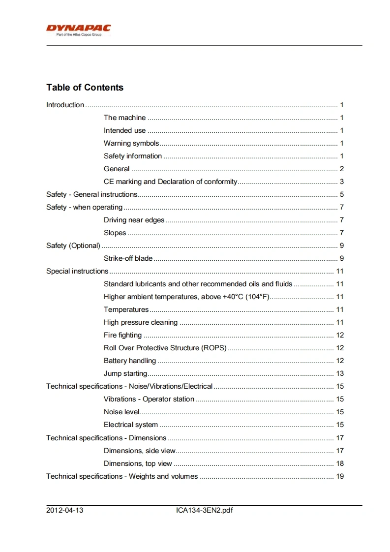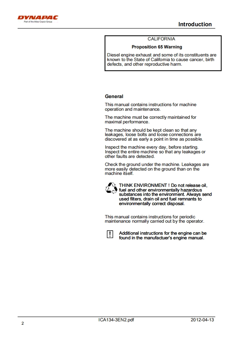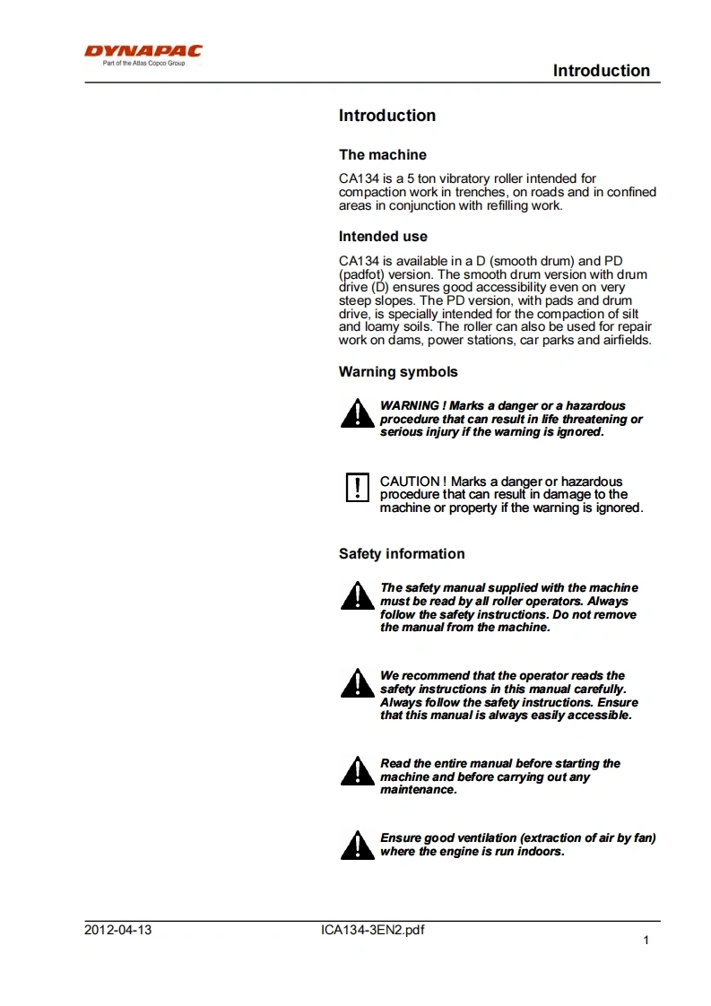 DYNAPACPart of the Atlas Copco GroupInstructions manualICA134-3EN2.pdfDriving MaintenanceVibratory rollerCA134EngineJohn Deere 5030HF285Serial number10000100x0A009546-DYNAPACDYNAPACTranslation of original instructionReservation for changesPrinted in Sweden