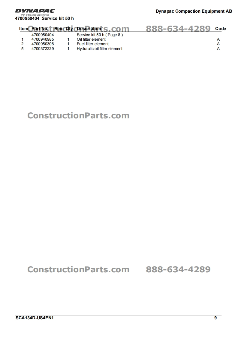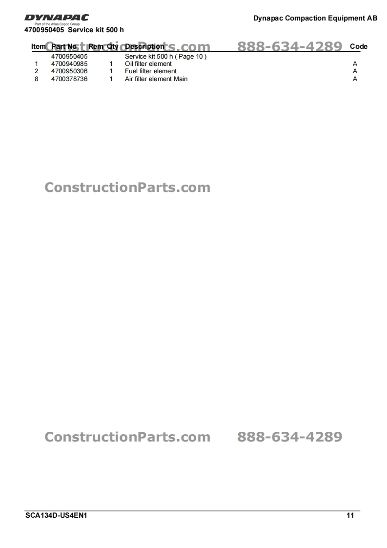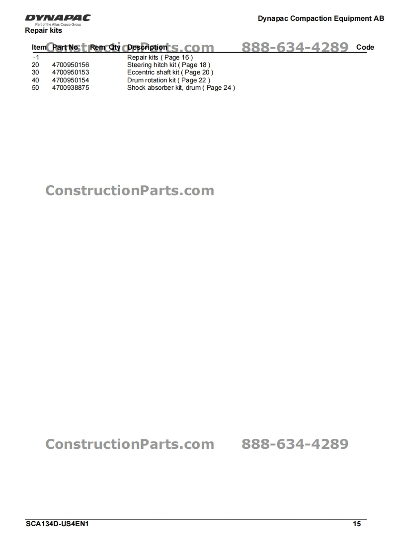 Vibratory RollerDVNAPACCA134DPart of the Atlas Copco GroupConstructionParts.com888-634-4289Spare Parts CatalogueSCA134D-US4EN1Valid from roller serial number:10000100x0D000001-ConstructionParts.comDYNAPACDYNAPACDiesel engine:John Deere 5030HF285Published catalogue issues valid for these rollers:CatalogueIssue dateValid for serial numbersSCA134D-US4EN12010-0510000100x0D000001-ConstructionParts.com888-634-4289We reserve the right to change specifications without noticePrinted in Sweden.