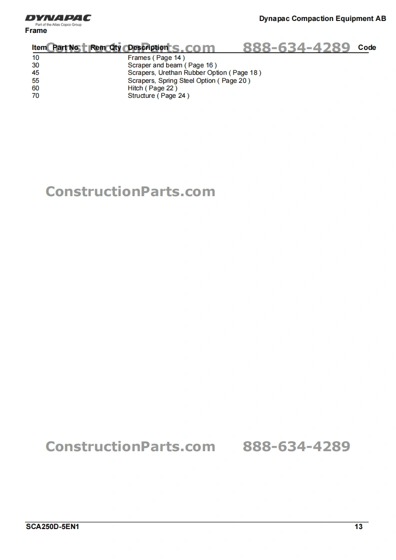 Vibratory RollerDYNAPACCA250D-lIPart of the Atlas Copco GroupConstructionParts.com888-634-4289Spare Parts CatalogueSCA250D-5EN1Valid from roller serial number:10000108x0A000001-ConstructionParDYNAPACDYNAPACDiesel engines:Cummins QSB 4.5CPublished catalogue issues valid for these rollers:CatalogueIssue date Valid for serial numbersSCA250D-5EN12010-0310000108x0A000001-ConstructionParts.com888-634-4289We reserve the right to change specifications without noticePrinted in Sweden.