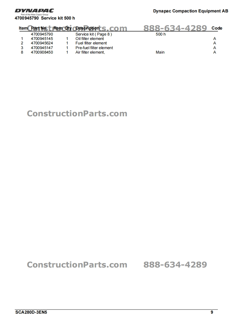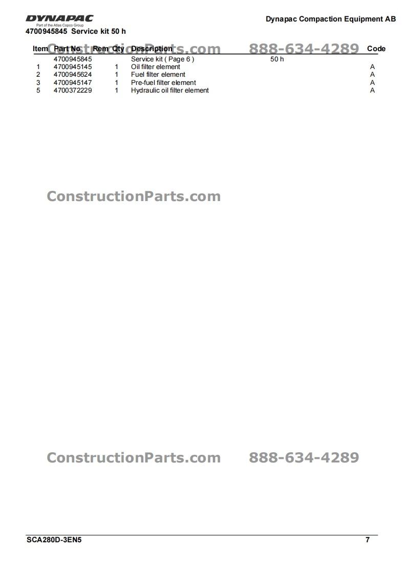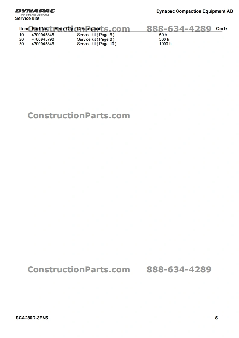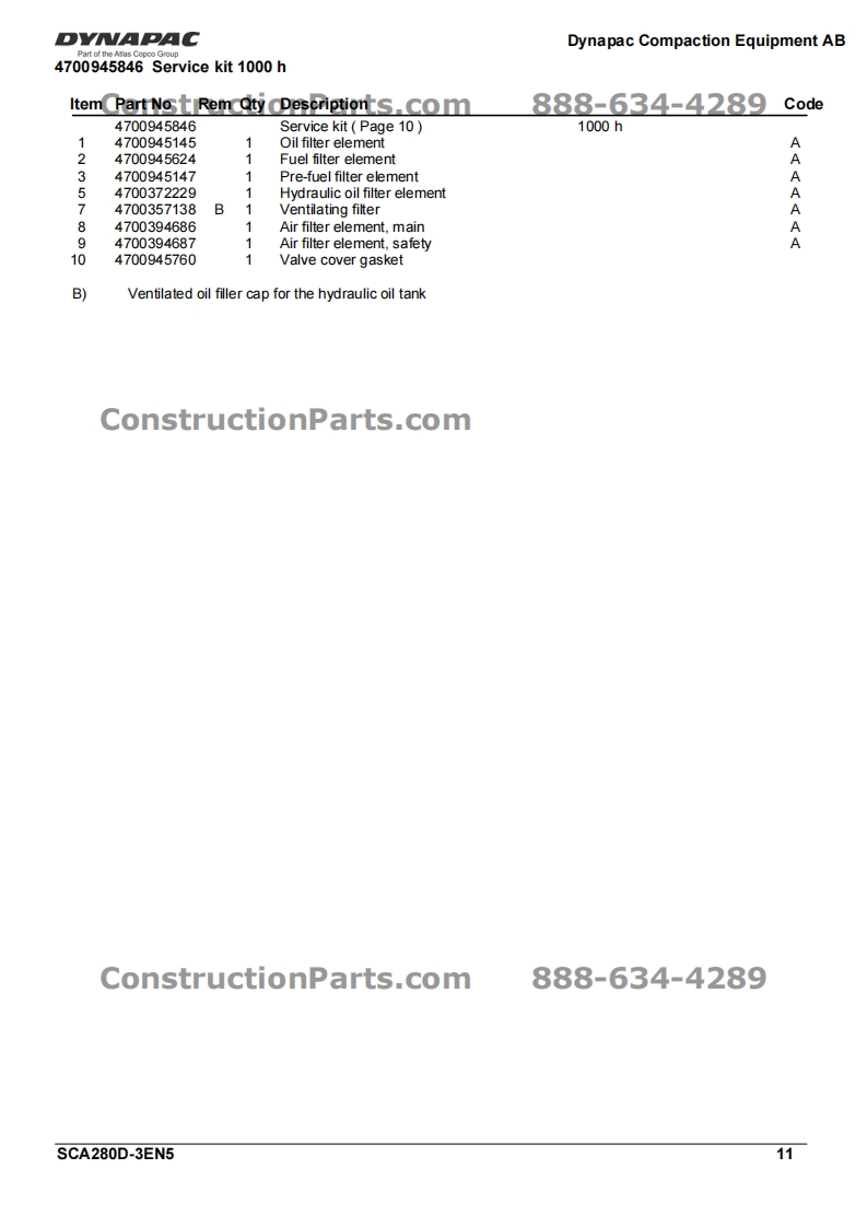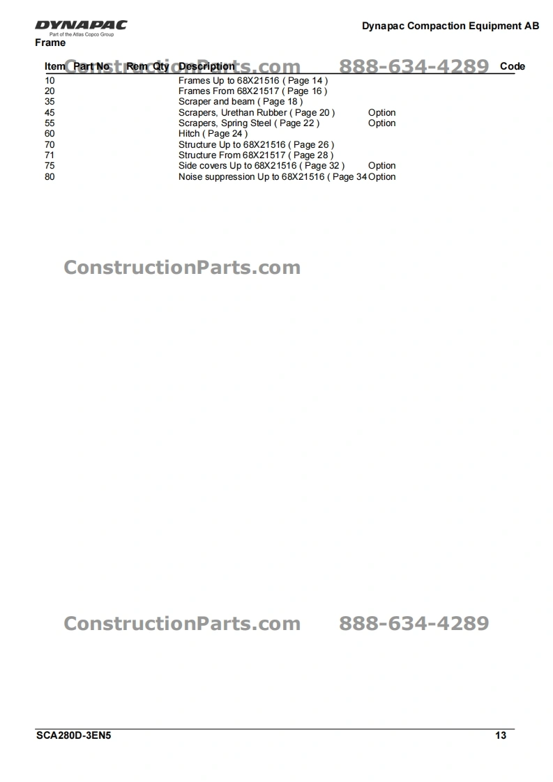 DY·CConstructionParts.com888-634-4289Vibratory RollerCA280D/CA280D-IISpare Parts CatalogueSCA280D-3EN5Valid from roller serial number:*68921200-*Diesel engines:ConstructionPareMMINSTosB 4.5cPublished catalogue issues valid for these rollers:CatalogueIssue dateValid for serial numbersSCA280D-3EN12007-03Replaced by SCA280D-3EN2SCA280D-3EN22009-04Replaced by SCA280D-3EN3SCA280D-3EN32009-04Replaced by SCA280D-3EN4SCA280D-3EN42009-11Replaced by SCA280D-3EN5SCA280D-3EN52010-02*68921200*-DYNAPACDYNAPACConstructionParts.com888-634-4289We reserve the right to change specifications without notice.Printed in Sweden.