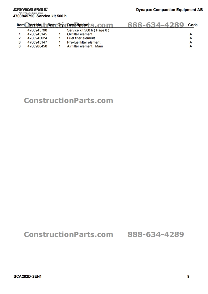 Vibratory RollerDVNAPACCA282DPart of the Atlas Copco GroupConstructionParts.com888-634-4289Spare Parts CatalogueSCA282D-2EN1Valid from roller serial number:10000126x0A000001-ConstructiomDYNAPACDYNAPACDiesel engines:Cummins QSB 4.5CPublished catalogue issues valid for these rollers:CatalogueIssue dateValid for serial numbersSCA282D-2EN12010-0310000126x0A000001-ConstructionParts.com888-634-4289We reserve the right to change specifications without noticePrinted in Sweden.
