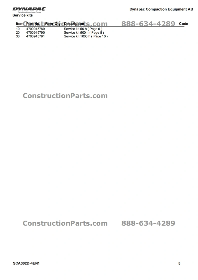 Vibratory RollerDYNAPACCA302DPart of the Atlas Copco GroupConstructionParts.com888-634-4289Spare Parts CatalogueSCA302D-4EN1Valid from roller serial number:10000116x0A000001-ConstructionOYAPACDYAPACDiesel engines:Cummins QSB 4.5CPublished catalogue issues valid for these rollers:CatalogueIssue dateValid for serial numbersSCA302D-4EN12010-0310000116x0A000001-ConstructionParts.com888-634-4289We reserve the right to change specifications without noticePrinted in Sweden.