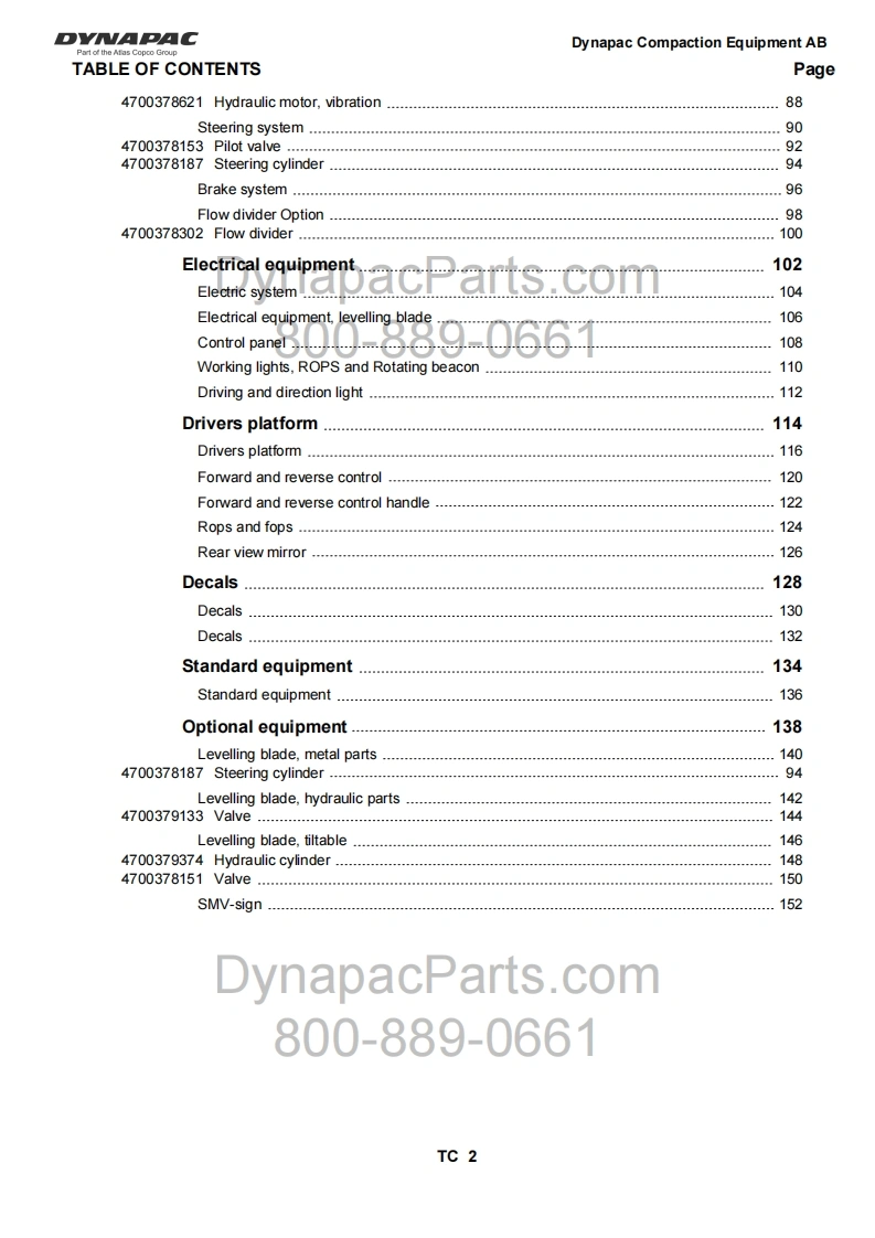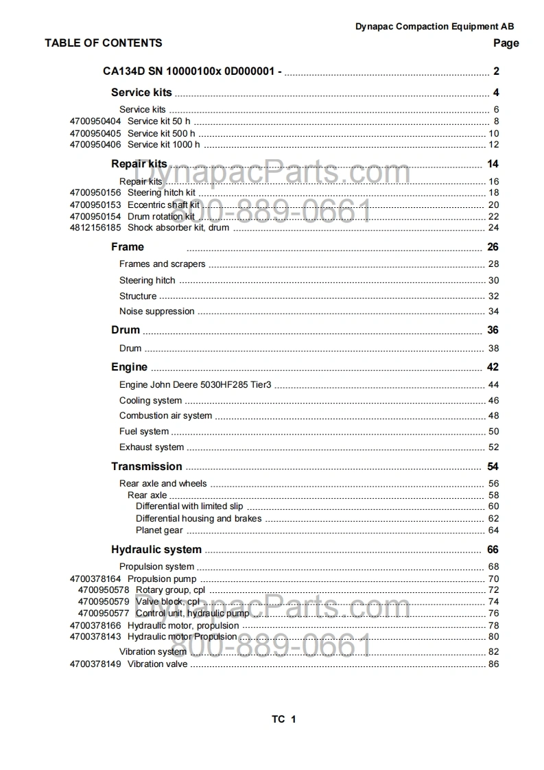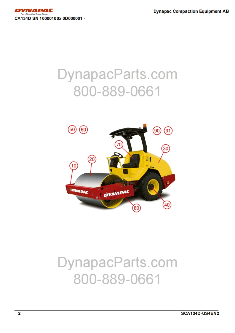 Vibratory RollerDYNAPACCA134DPart of the Atlas Copco GroupSpare Parts CatalogueSCA134D-US4EN2DynapacParts.comValid from roller serial number:800100703g0200g61DYNAPACDYNAPACDiesel engine:John Deere 5030HF285Published catalogue issues valid for these rollers:CatalogueIssue dateValid for serial numbersSCA134D-US4EN12010-05Replaced by SCA134D-US4EN2SCA134D-US4EN22011-10See aboveDynapacParts.com800-889-0661We reserve the right to change specifications without noticePrinted in Sweden.