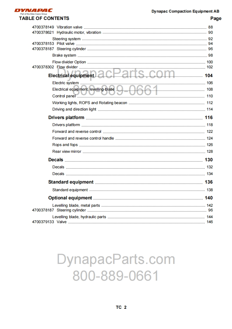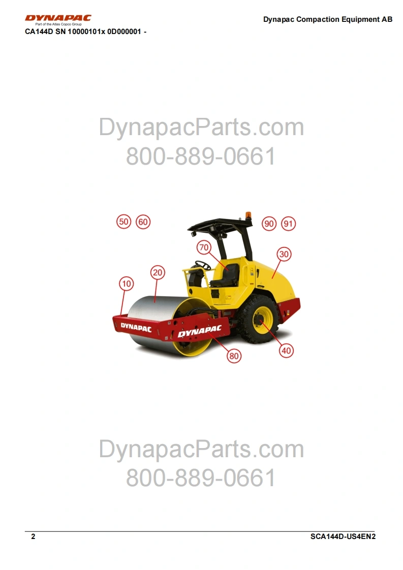 Vibratory RollerV几UM每红CCA144DPart of the Atlas Copco GroupSpare Parts CatalogueSCA144D-US4EN2DynapacParts.comValid from roller serial number:80010001890200g61DYNAPACDiesel engine:John Deere 5030HF285Published catalogue issues valid for these rollers:CatalogueIssue dateValid for serial numbersSCA144D-US4EN12010-05Replaced by SCA144D-US4EN2SCA144D-US4EN22011-11See aboveDynapacParts.com800-889-0661We reserve the right to change specifications without noticePrinted in Sweden.
