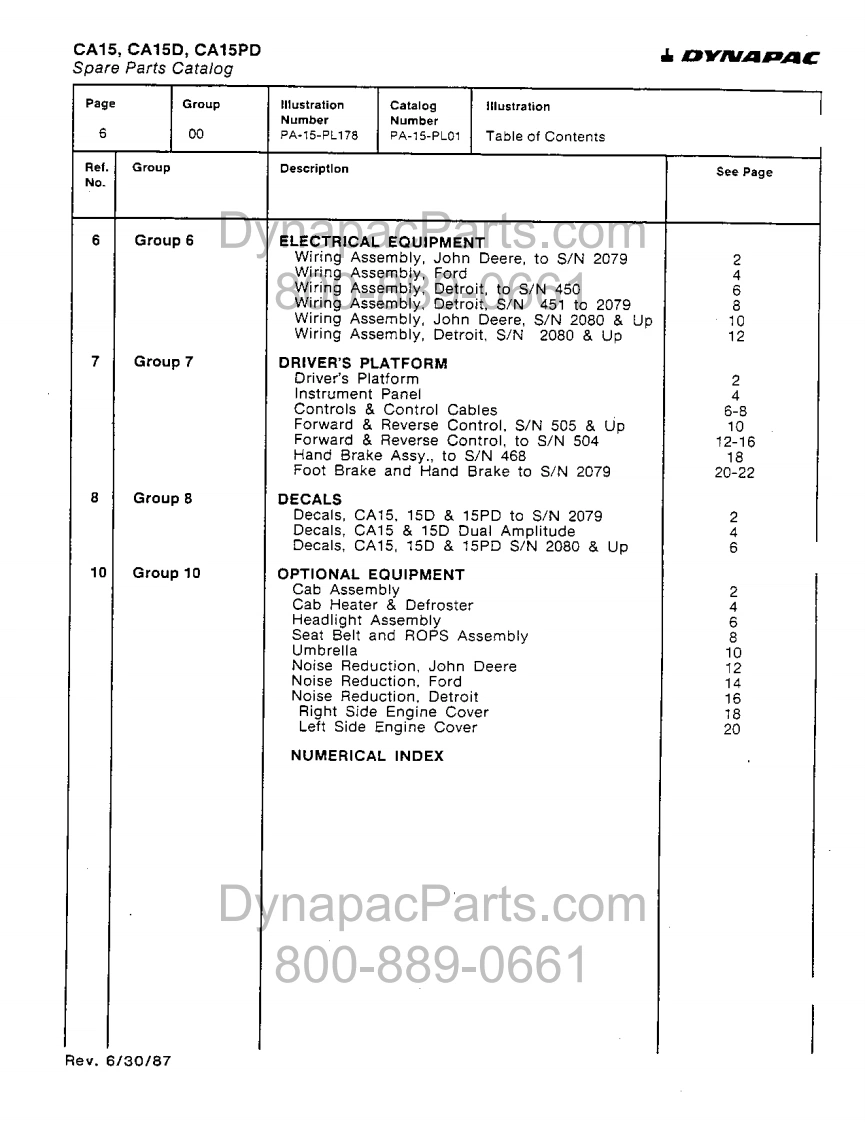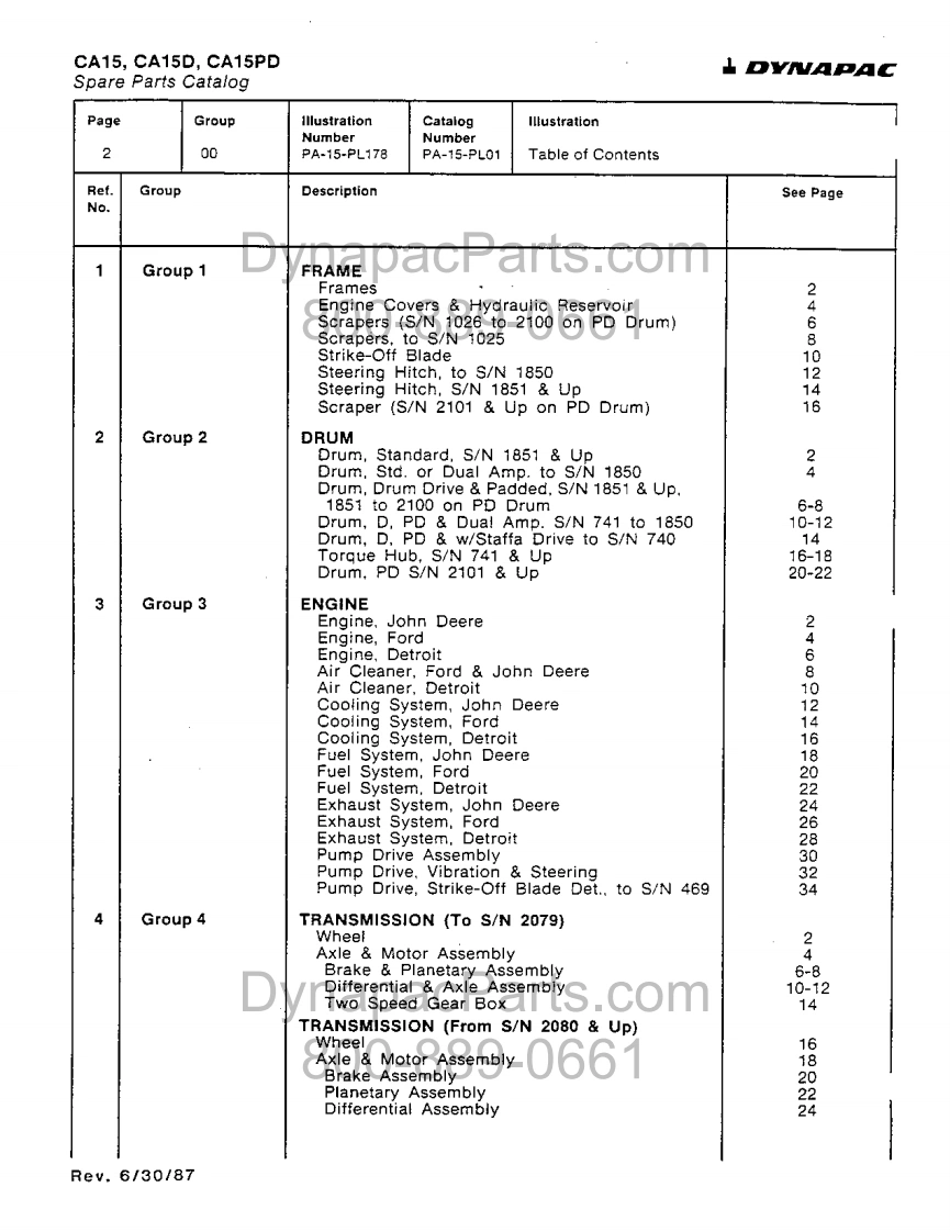 SPARE PARTSCATALOGcom90661EnginesSPARE PARTS CATALOGJ.DeereDetroitCA15FordVIBRATORY ROLLERAxlesHurthRockwellPA-15-PL01Reprinted June 1987Order No.829009DynapacParts.com800-889AcHEAVY CONSTRUCTION EQUIPMENTU.S.AP.O.Box 360.SWEDENBRAZILStanhope.NJ.07874 U.S.AP.0.Bcx504P.0.Be%5694CANADAJAPAN560 Paclhc Gate2011347-0700含28gSao Paulo.Brazil1-8.Yanagisaki 1-chome-552-2930Mississauga.LST 1Y1.OntarioTelex:43041 DYNKAR SP8ne011-491-6000Telex 1171833 DYNP BAPhane416-67-7270Saitama-ken.333 JacanTelex:05968962 DYNTORP0ne:8142650123Telex 2962569 DWKAWA J