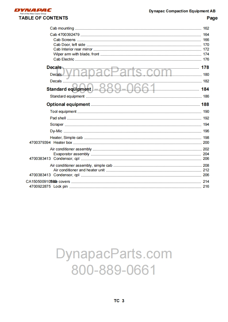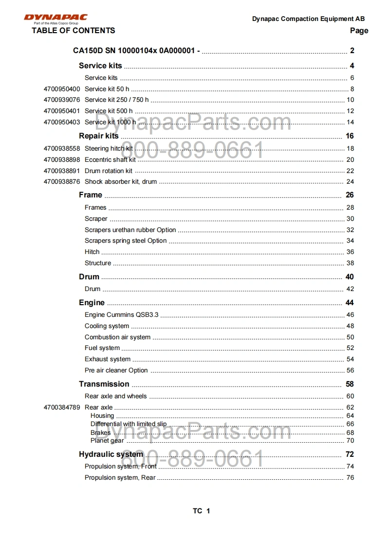 Vibratory Roller切YMaCCA150DPart of the Atlas Copco GroupSpare Parts CatalogueSCA150D-4EN2DynapacParts.comValid from roller serial number:80010010g9400361Diesel engines:Cummins QSB 3.3Published catalogue issues valid for these rollers:CatalogueIssue dateValid for serial numbersSCA150D-4EN12010-03Replaced by SCA150D-4EN2SCA150D-4EN22011-11See aboveDynapacParts.com800-889-0661We reserve the right to change specifications without noticePrinted in Sweden.