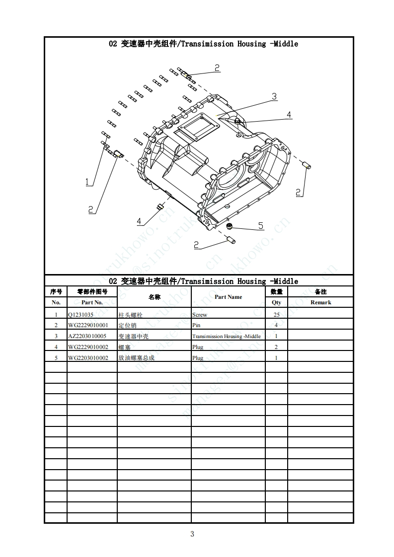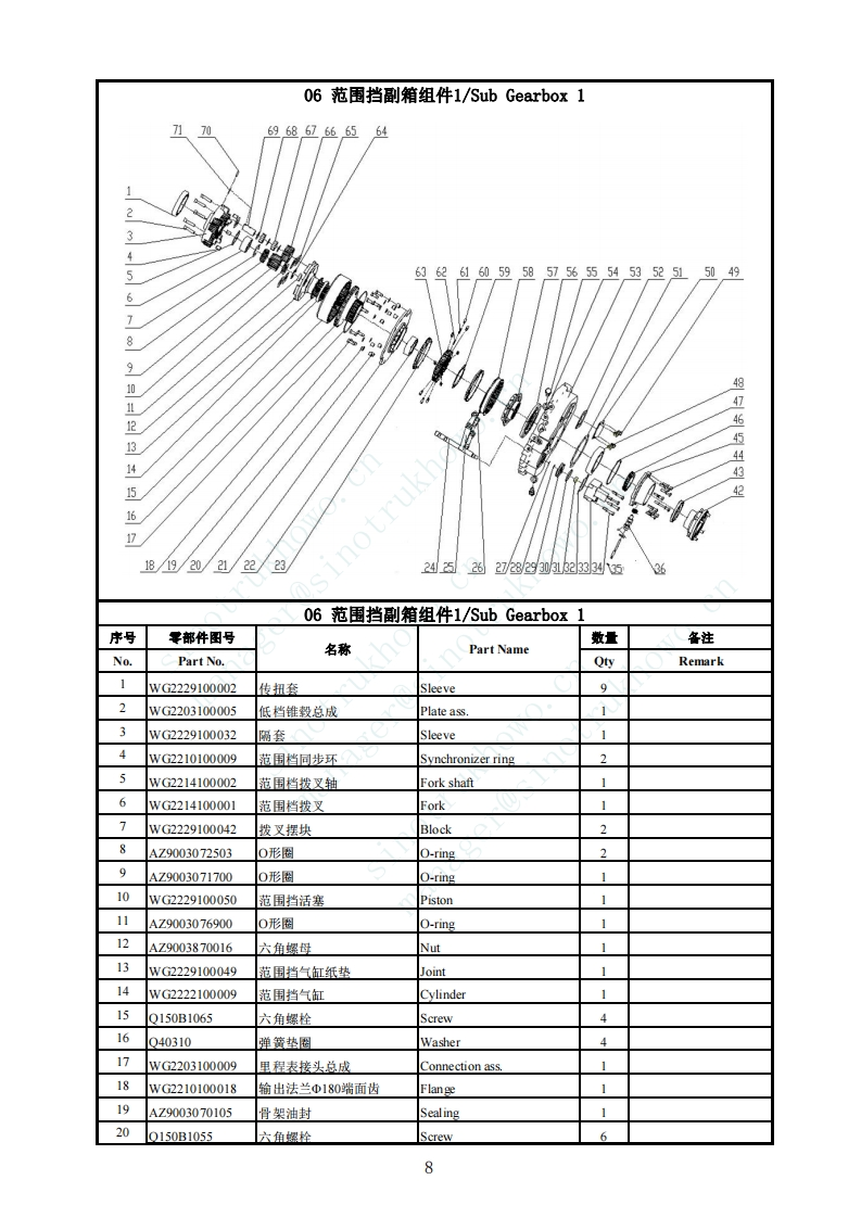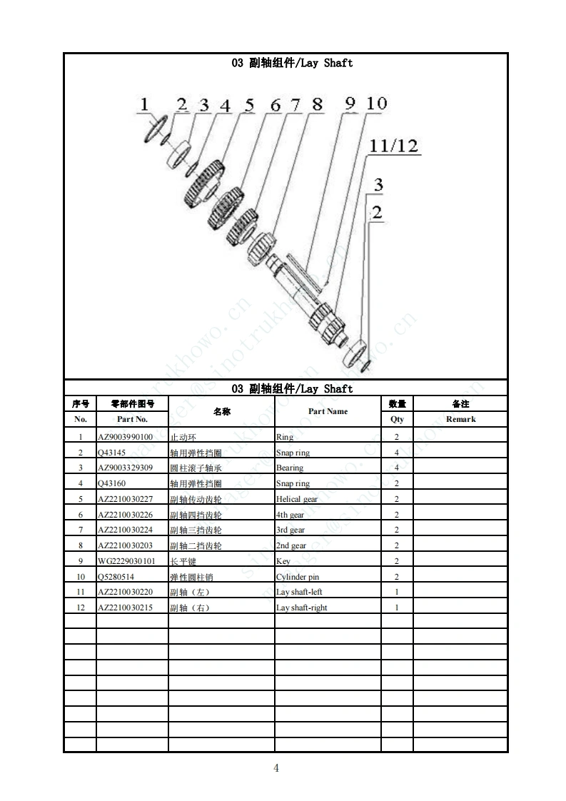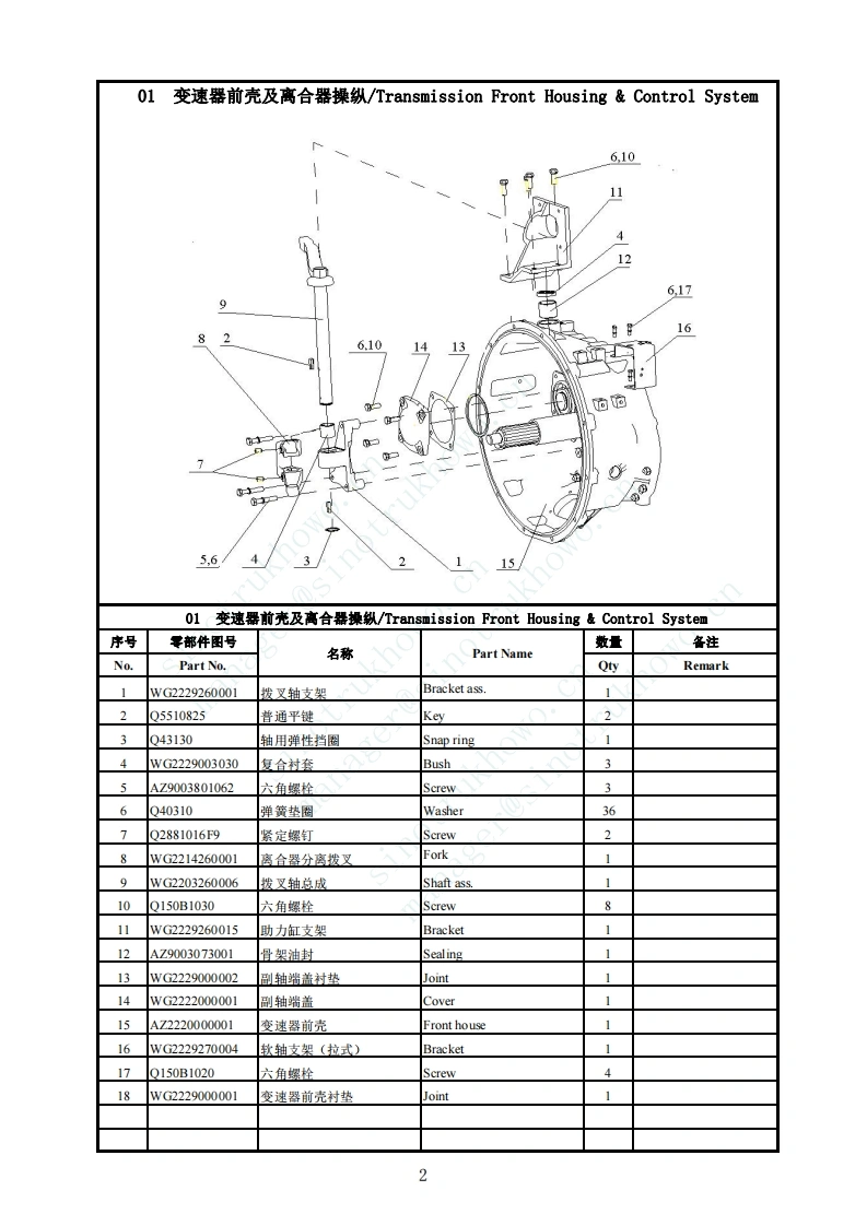HW197l0(C)变速器及其操纵/Transmission&Control System序号名称总成页码车型页码1变速器前壳及离合器操纵/Transmission Front1Housing Control System2变速器中壳组件/Transimission Housing-Middle2副轴组件/Lay Shaft主轴组件/Main Shaft45惰轮轴组件/Idle Wheel56范围挡副箱组件1/Sub Gearbox16>范围挡副箱组件2/Sub Gearbox2●10输入轴及端盖组件/Import Shaft and Cover9小盖及气助力组件/Small Cover12owo.cn10拨叉轴总成(HW19710)/Fork Shaft(HW19710)1410拨叉轴总成(HW19710C)/Fork Shaft(W19710C)15油泵及管路组件(HW19710)Pump and Pipe(HW19710)1611油泵及管路组件(HW19710C)/Pump and Pipe(H19710C1712变速器气动管路阀组件/Air Pipe and Valve18