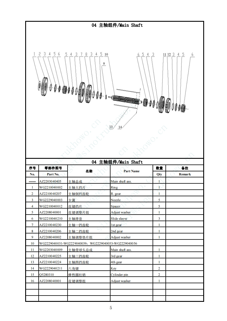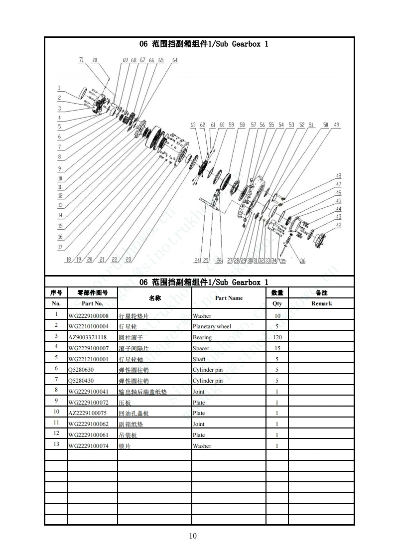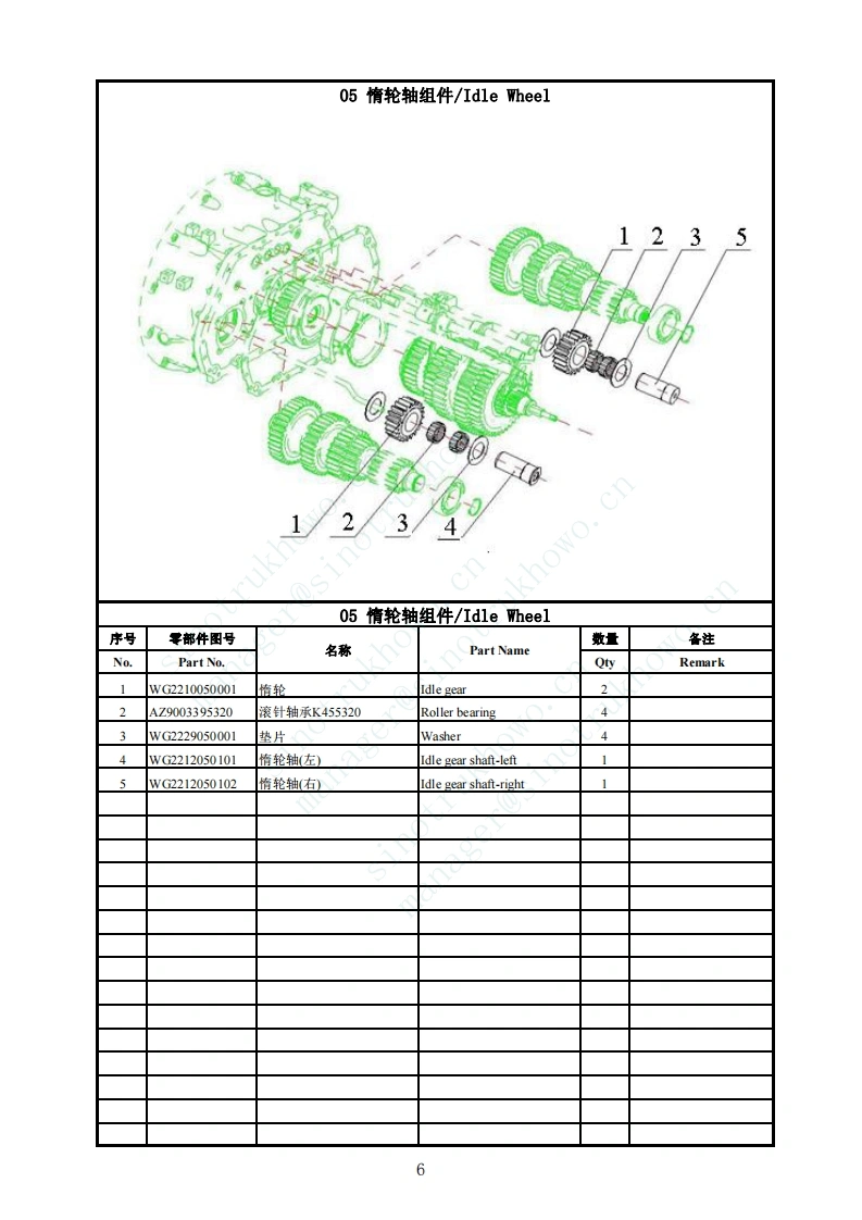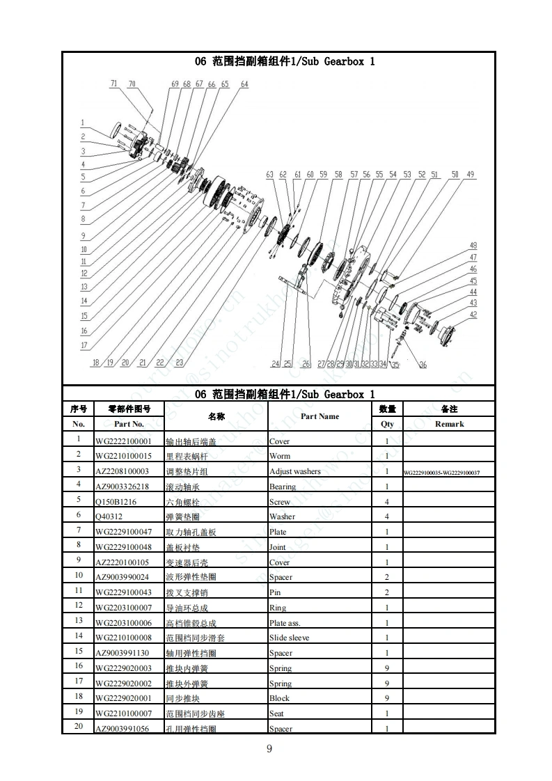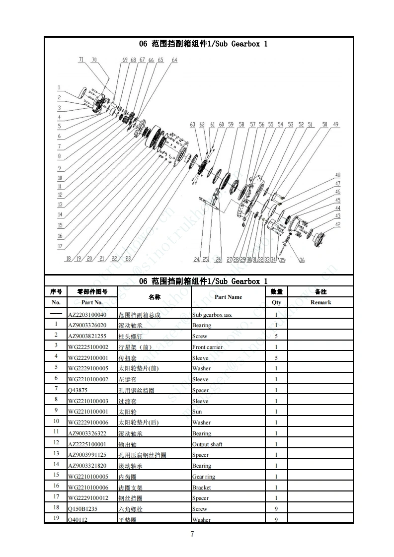 HW197l0(C)变速器及其操纵/Transmission&Control System序号名称总成页码车型页码1变速器前壳及离合器操纵/Transmission Front1Housing Control System2变速器中壳组件/Transimission Housing-Middle2副轴组件/Lay Shaft主轴组件/Main Shaft45惰轮轴组件/Idle Wheel56范围挡副箱组件1/Sub Gearbox16>范围挡副箱组件2/Sub Gearbox2●10输入轴及端盖组件/Import Shaft and Cover9小盖及气助力组件/Small Cover12owo.cn10拨叉轴总成(HW19710)/Fork Shaft(HW19710)1410拨叉轴总成(HW19710C)/Fork Shaft(W19710C)15油泵及管路组件(HW19710)Pump and Pipe(HW19710)1611油泵及管路组件(HW19710C)/Pump and Pipe(H19710C1712变速器气动管路阀组件/Air Pipe and Valve18