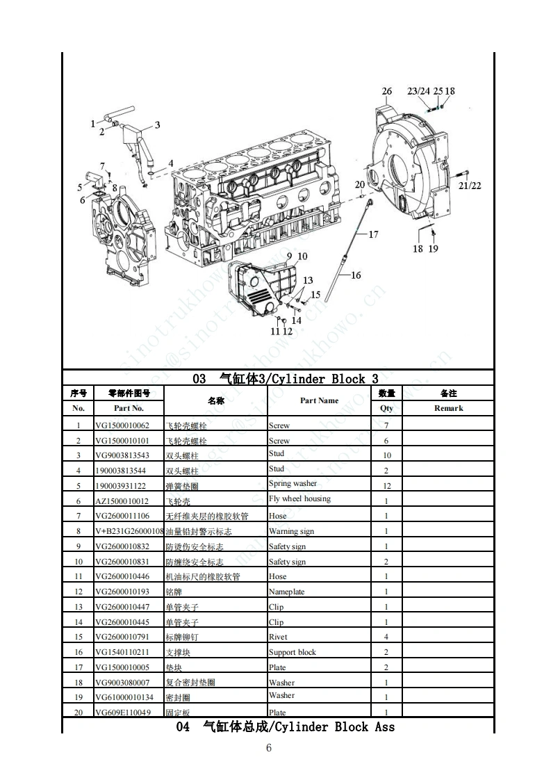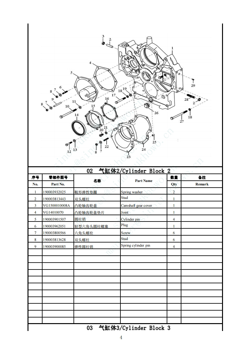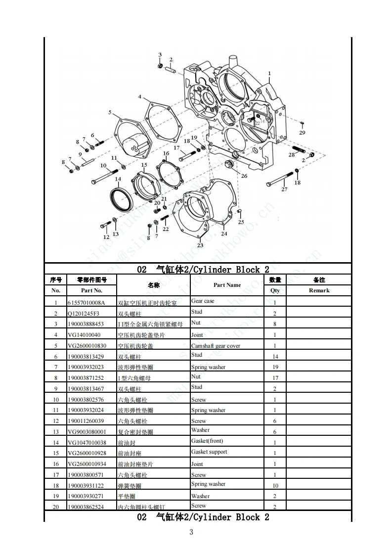 WD615发动机(E2)/Engine序号名称总成页码车型页码3.01气缸体1/Cylinder Block113.02气缸体2/Cvlinder Block223.03气缸体3/Cvlinder Block33.04气缸体总成/Cylinder Block Ass63.05曲轴及飞轮/Crankshaft and Flywheel73.06连杆与活塞/Connecting Rod and Piston83.07气缸盖/Cylinder Head93.08配气机构/Vave-Gear Mechanism113.09燃油滤清器部分(M+HVFuelFilter133.1冷却系统及发动机前支撑/Cooling System&Front Bracket143.11机油泵和机油滤清器/Oil Pump and Oil Filter163.12供油系/Fuel Supply System Subgroup183.13进排气系统/Intake Manifold and Exhaust Manifold213.14发动机、起动机及传感器组/Engine、Starter&Sensor243.15双缸空压机/Compressor253.16油底壳/O1Pan26manager@