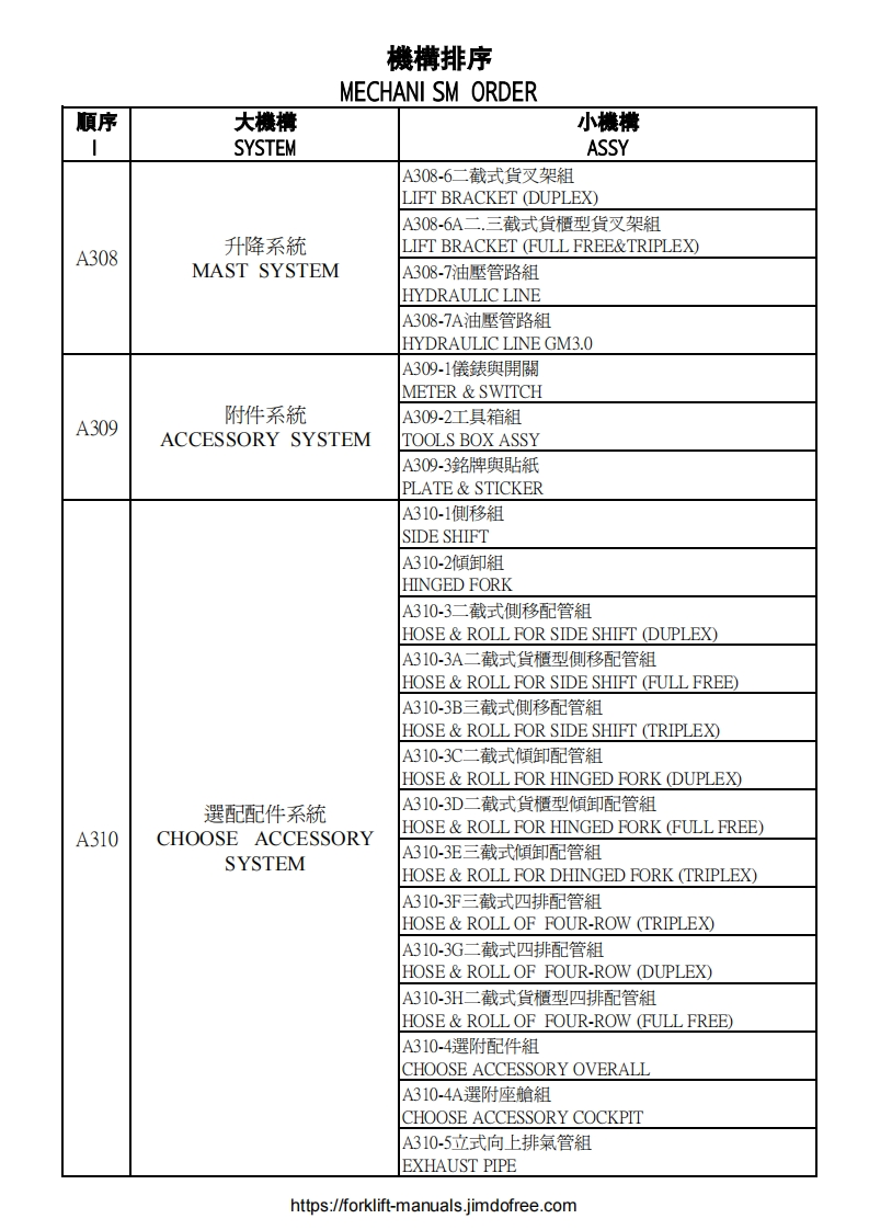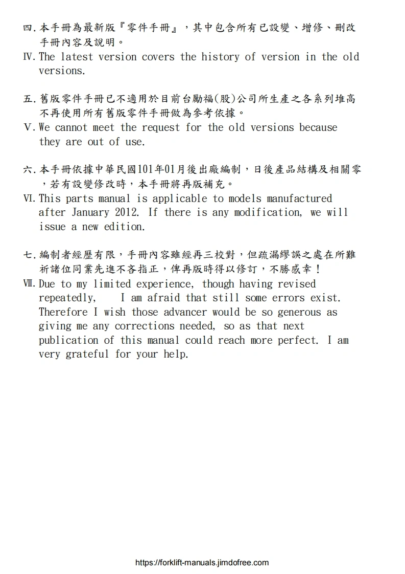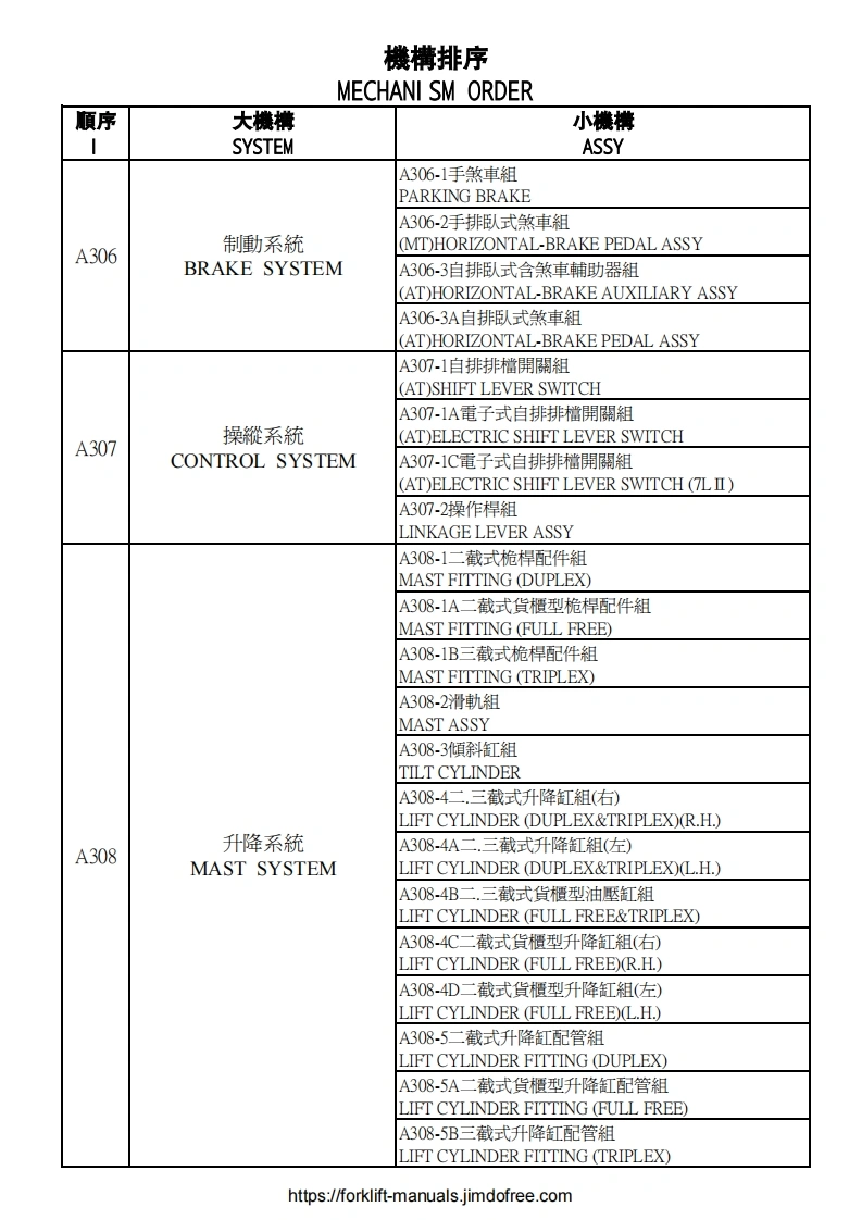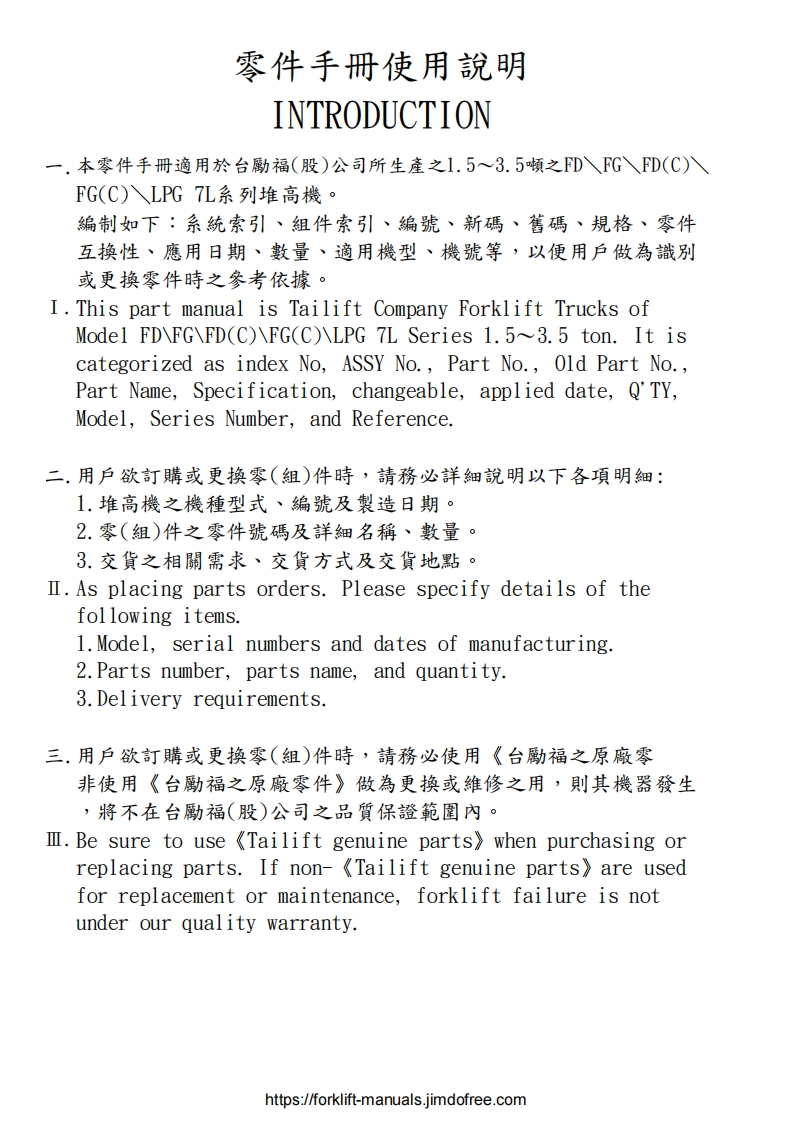 台励福Tailift-FD-FG-15-35-Parts-Manual零部件图册找手册网23小时前发布关注私信5.31MB100页047台励福Tailift-FD-FG-15-35-Parts-Manual零部件图册此内容为付费资源,请付费后查看¥29¥31黄金会员免费钻石会员免费立即购买您当前未登录!建议登陆后购买,可保存购买订单付费资源 第1页 / 共100页 第2页 / 共100页 第3页 / 共100页 第4页 / 共100页 第5页 / 共100页 第6页 / 共100页 第7页 / 共100页 第8页 / 共100页 第9页 / 共100页 第10页 / 共100页 试读已结束,还剩90页,您可下载完整版后进行离线阅读 THE END柳工/临工/龙工/台励福 文本预览 ailift台勵福PARTS LIST零件手冊FD/F615/18/20/2530/35TCP/FL15/18/20/25/30/35台勵福7几/TCP系列堆高機Tailift 7L/TCP Series Forklift TrucksTAILIFT CO.,LTD.DEC044/132012https://forklift-manuals.jimdofree.com 查看更多 收起部分 喜欢就支持一下吧收藏