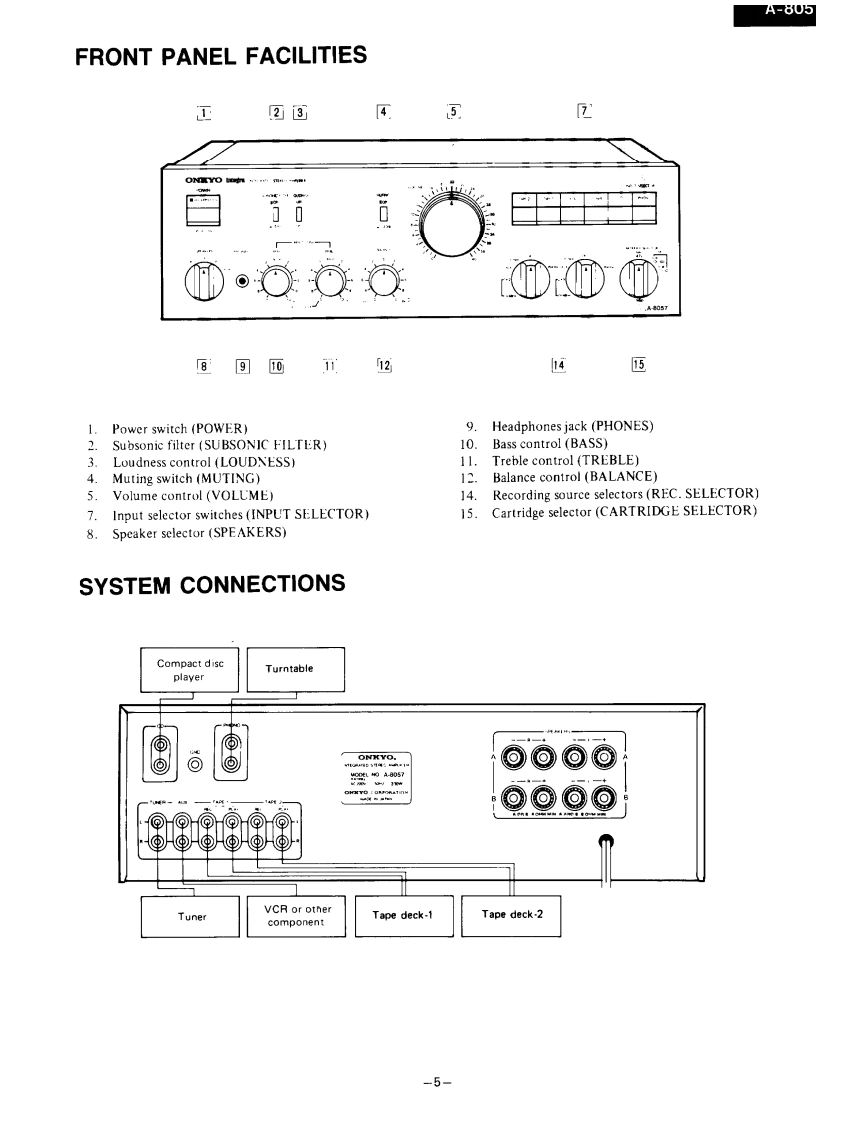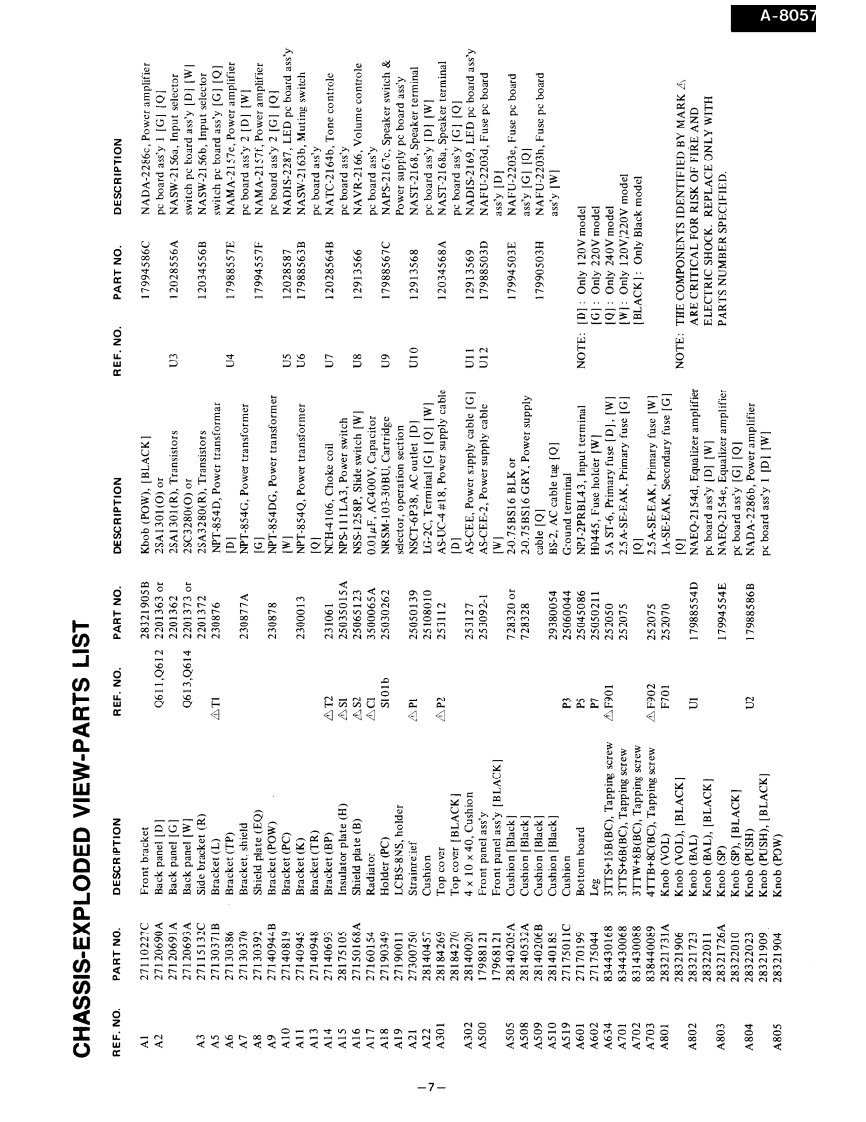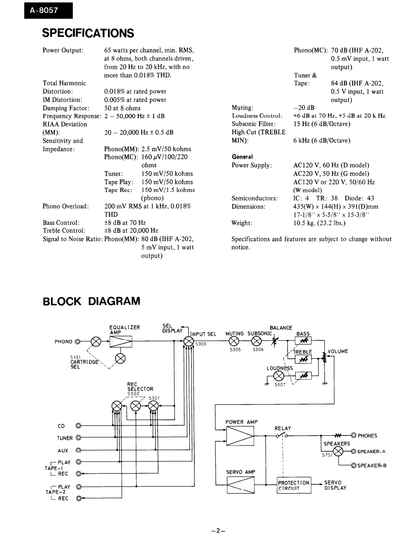 A-8057SERIAL No.3195ONKYO SERVICE MANUALIntegrated Stereo AmplifierMODEL A-8057Silver and Black modelsUDN,UD120V AC,60HzUG220V AC,50HzUW120Vor220VAC,50/60HzSAFETY-RELATED COMPONENT WARNING!TABLE OF CONTENTSCOMPONENTS IDENTIFIED BY MARK A ON THESCHEMATIC DIAGRAM AND IN THE PARTS LIST AREItemPageCRITICAL FOR RISK OF FIRE AND ELECTRIC SHOCK.Specifications2REPLACE THESE COMPONENTS WITH ONKYO PARTSBlock diagram2WHOSE PARTS NUMBERS APPEAR AS SHOWN IN THISPrecautions4MANUAL.Main amplifier adjustment4Front panel facilities5MAKE LEAKAGE-CURRENT OR RESISTANCE MEA-System connections5SUREMENTS TO DETERMINE THAT EXPOSED PARTSExploded view6ARE ACCEPTABLY INSULATED FROM THE SUPPLYParts list7CIRCUIT BEFORE RETURNING THE APPLIANCE TOPrinted circuit board parts list8THE CUSTOMER.Packing procedures10Printed circuit board view11Schematic diagram13,17O✉OAUDIO COMPONENTS
