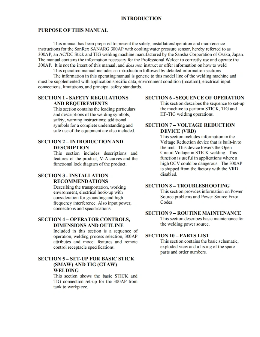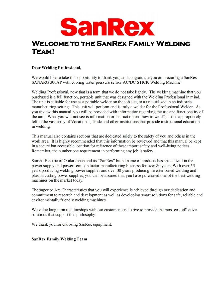 SANREX-191125_SANARG-300AP-Op-manual-RevAC-22JAN2020CJD操作手册含电器原理图找手册网22小时前发布关注私信2.57MB97页037SANREX-191125_SANARG-300AP-Op-manual-RevAC-22JAN2020CJD操作手册含电器原理图此内容为付费资源,请付费后查看¥19¥21黄金会员免费钻石会员免费立即购买您当前未登录!建议登陆后购买,可保存购买订单付费资源 第1页 / 共97页 第2页 / 共97页 第3页 / 共97页 第4页 / 共97页 第5页 / 共97页 第6页 / 共97页 第7页 / 共97页 第8页 / 共97页 第9页 / 共97页 第10页 / 共97页 试读已结束,还剩87页,您可下载完整版后进行离线阅读 THE ENDSanrex 文本预览 SanRexSANARG300APWITH COOLING WATERPRESSURE SENSORAC/DC/AC-SOFTINVERTERARC WELDEROperatorsManualVersion No:AC Issue Date:JAN 22,2020Manual No:K00A0316500 查看更多 收起部分 喜欢就支持一下吧收藏