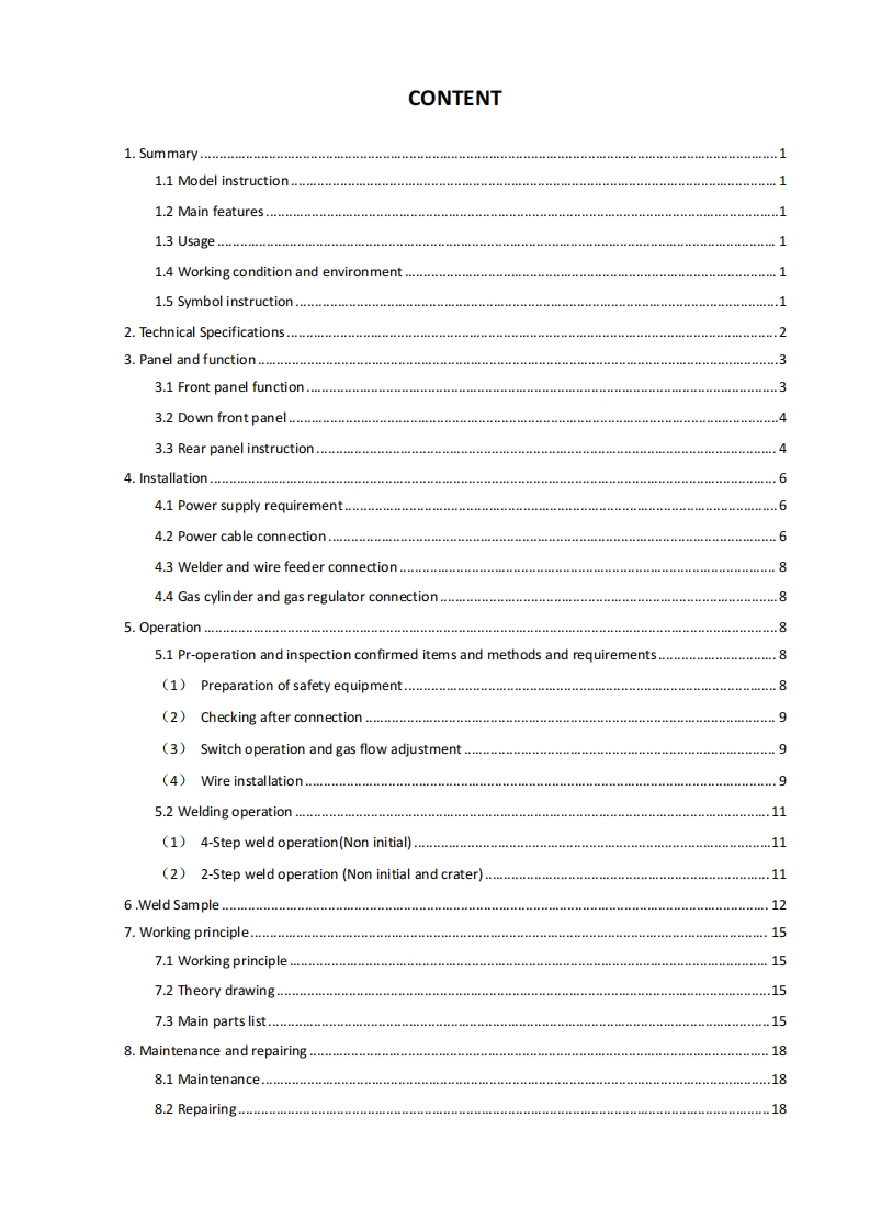 NB-500630HK操作与维护手册找手册网19天前发布关注私信2.42MB31页041NB-500630HK操作与维护手册此内容为付费资源,请付费后查看¥19¥21黄金会员免费钻石会员免费登录购买付费资源 第1页 / 共31页 第2页 / 共31页 第3页 / 共31页 第4页 / 共31页 第5页 / 共31页 第6页 / 共31页 第7页 / 共31页 第8页 / 共31页 第9页 / 共31页 第10页 / 共31页 试读已结束,还剩21页,您可下载完整版后进行离线阅读 THE END华远 文本预览 NB-500/630HKMIG/MAG/CO2 WELDING MACHINEMANUALINSTRUCTION(PLEASE READ CAREFULLY BEFORE OPERATION) 查看更多 收起部分 喜欢就支持一下吧收藏