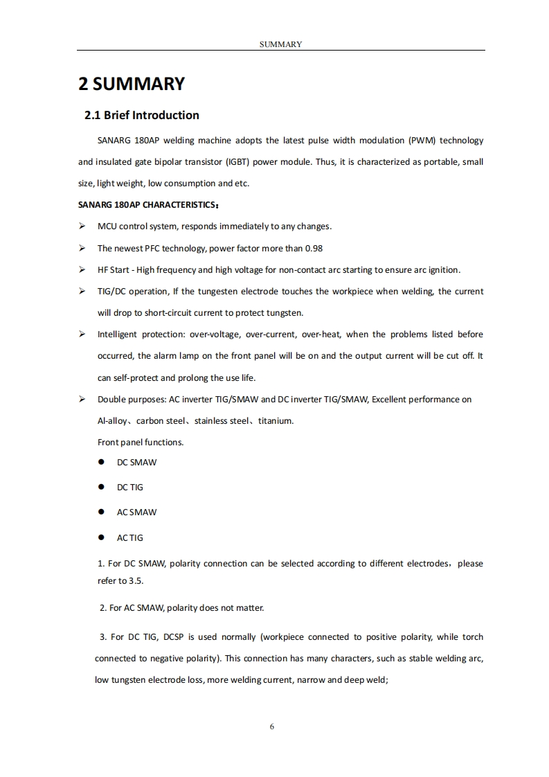 OPERATOR'S MANUALINVERTER AC/DC PULSED TIG WELDERSANARG 180APSanRexIMPORTANT:Read this Owner's Manual Completely before attempting to use thisequipment.Save this manual and keep it handy for quick reference.Pay particularattention to the safety instructions we have provided for your protection.Contact yourdistributor if you do not fully understand this manual.Date:11/24/24
