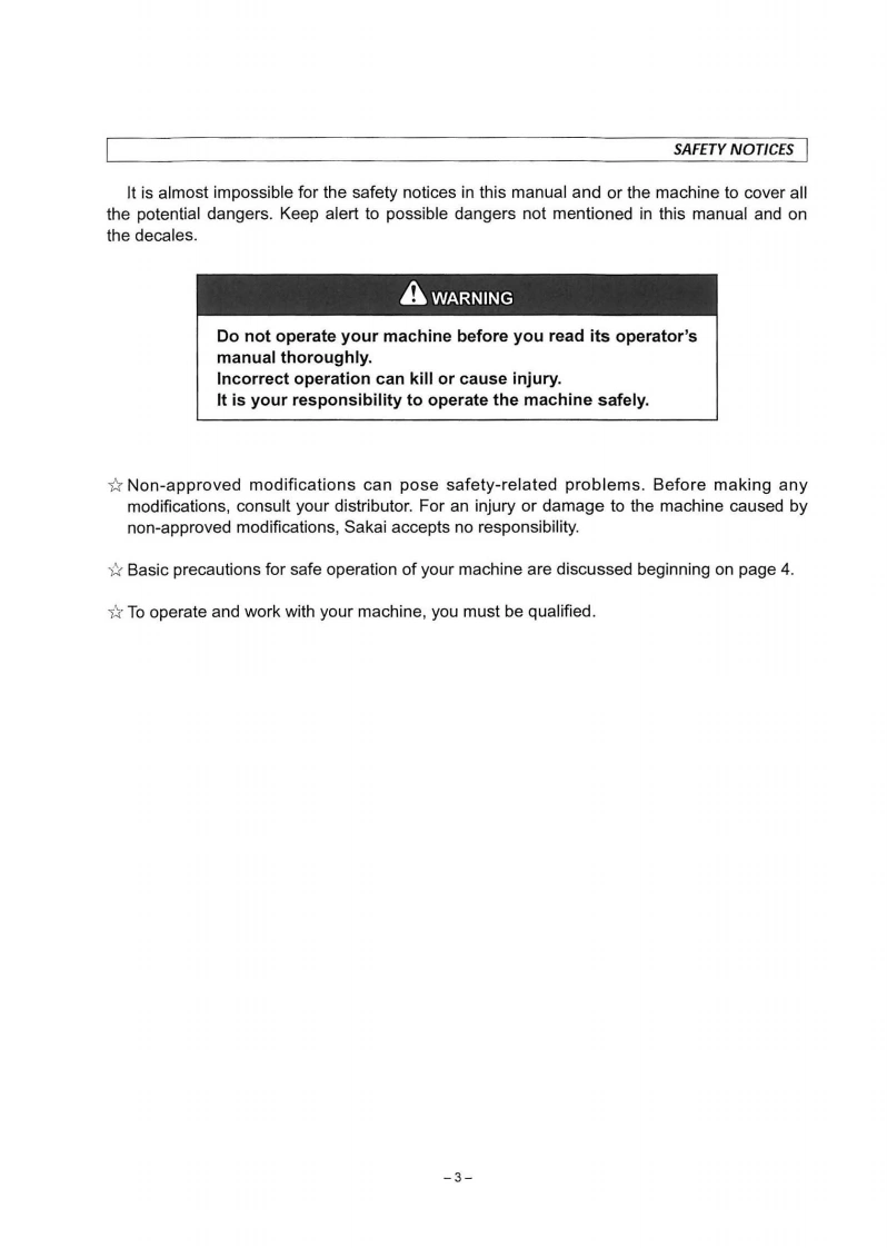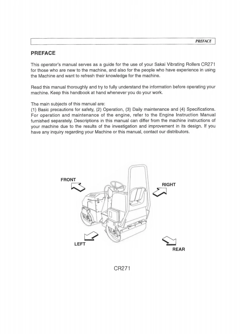 N0.3498-36200-0ARead this handbook thoroughly and understand the whole informationcontained before trying to operate,inspect and service your machine!OPERATINGMAINTENANCEINSTRUCTIONSMODELVIBRATINGROLLERCR271From CR271->4CR2-20101SAKAI