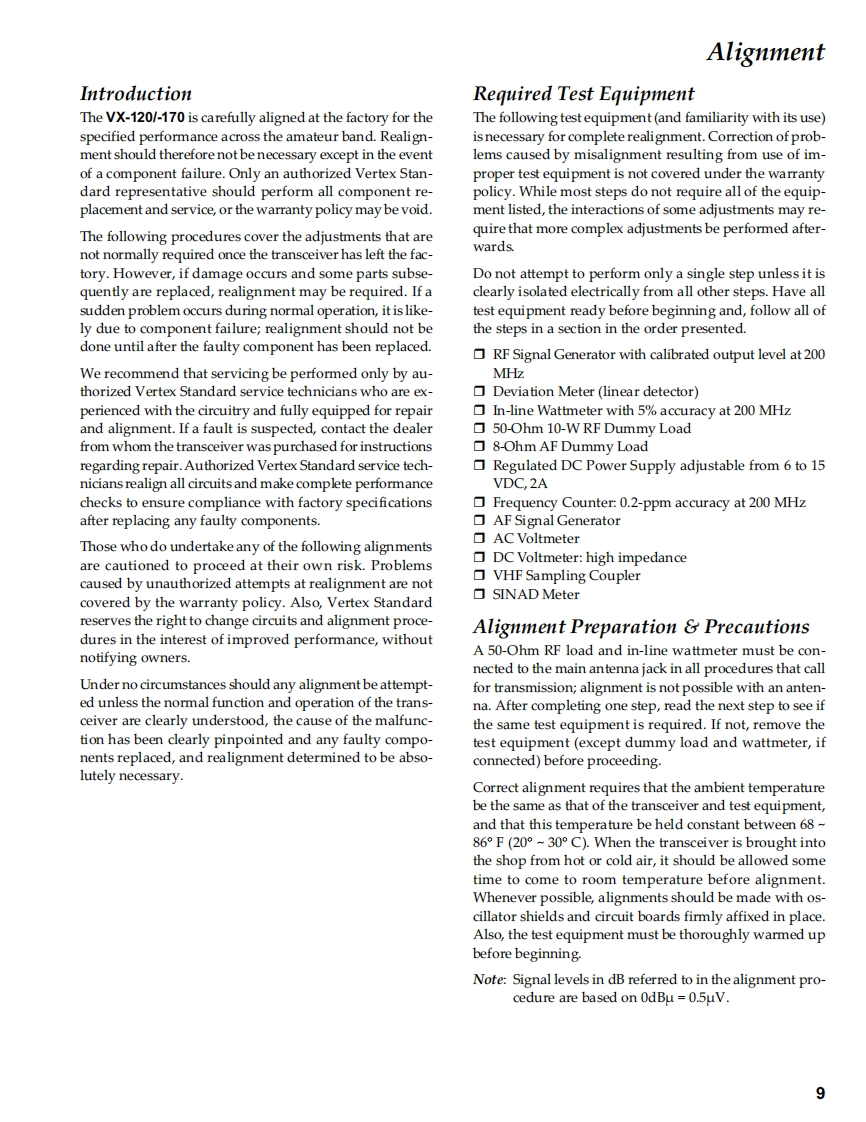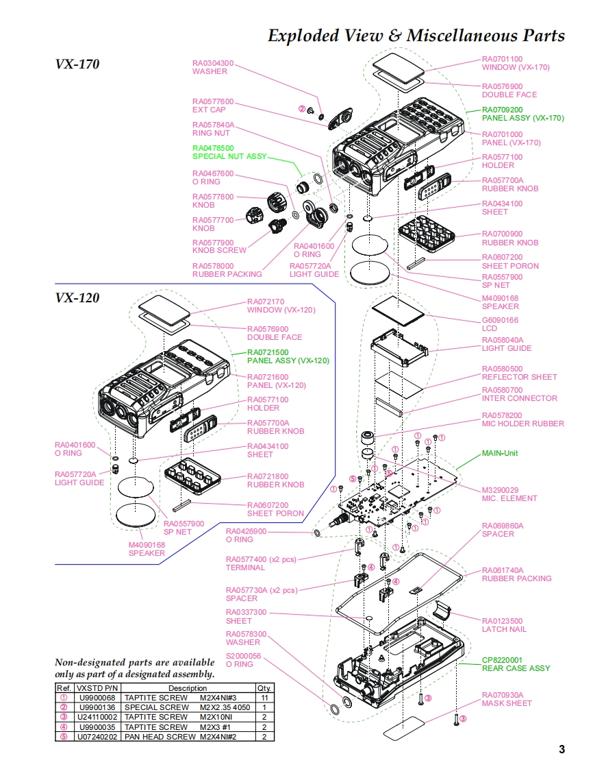 YAESUVERTEX STANDARD CO.,LTD.4-8-8 Nakameguro,Meguro-Ku,Tokyo 153-8644,JapanVERTEX STANDARDUS Headquarters10900 Walker Street,Cypress,CA 90630,U.S.A.vX-120/-170YAESU EUROPE B.V.P.O.Box 75525,1118 ZN Schiphol,The NetherlandsYAESU UK LTD.Unit 12,Sun Valley Business Park,Winnall CloseTechnical SupplementWinchester,Hampshire,SO23 OLB,U.K.VERTEX STANDARD HK LTD.2005 VERTEX STANDARD CO.,LTD.EHO22N90AUnit 5,20/F.,Seaview Centre,139-141 Hoi Bun Road,Kwun Tong,Kowloon,Hong KongVX-120VX-170IntroductionThis manual provides the technical information necessary for servicing the VX-120/-170 VHF FM Transceiver.Servicing this equipment requires expertise in handing surface-mount chip components.Attempts by non-qualifiedpersons to service this equipment may result in permanent damage not covered by the warranty,and may be illegal insome countries.Two PCB layout diagrams are provided for each double-sided board in this transceiver.Each side of the board isreferred to by the type of the majority of components installed on that side("Side A"or"Side B").In most cases oneside has only chip components(surface-mount devices),and the other has either a mixture of both chip and leadedcomponents(trimmers,coils,electrolytic capacitors,ICs,etc.),or leaded components only.While we believe the information in this manual to be correct,VERTEX STANDARD assumes no liability for damagethat may occur as a result of typographical or other errors that may be present.Your cooperation in pointing out anyinconsistencies in the technical information would be appreciated.ContentsSp ecificatiOnS2Exploded View Miscellaneous Parts ....3Block Diagram.5Circuit Description.......7Alignment.9Board Units (Schematics,Layouts Parts)Main Unit.........13FTD-7 DTMF Paging Unit (Option)..29