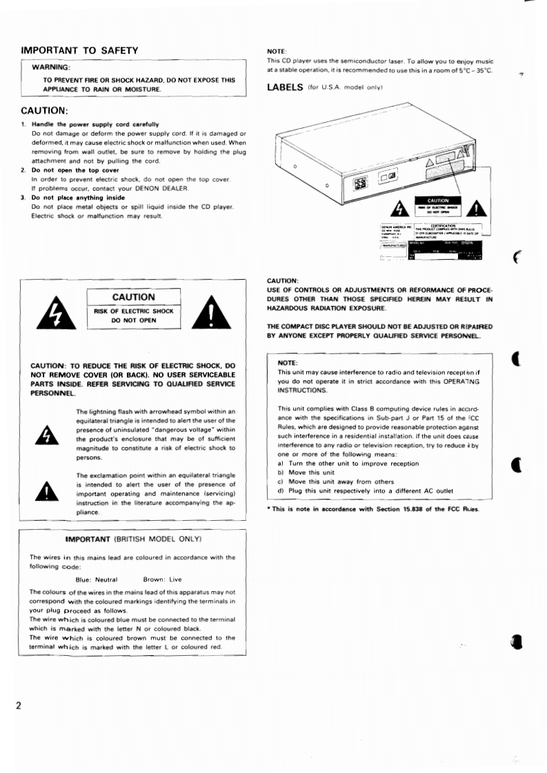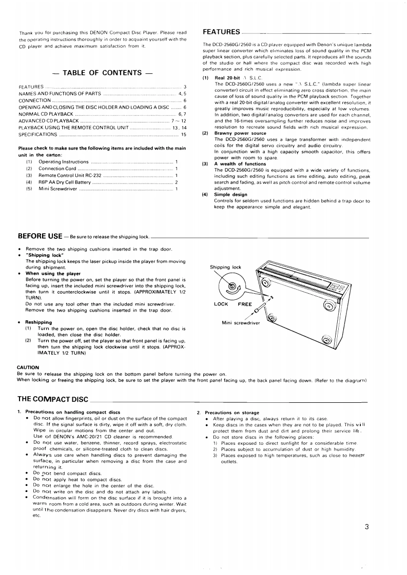 DENONHi-Fi ComponentSERVICE MANUALSTEREO CD PLAYERMODEL DCD-2560TABLE OF CONTENTSOPERATING INSTRUCTIONS2-14SPECIFICATIONS06…15NOTE FOR HANDLING OF LASER PICK-UP..............................................16-17DISASSEMBLY18-19ADJUSTMENT20-25HEAT RUN MODE FUNCTIONIC TERMINAL FUNCTION LIST27-31PARTS LIST OF P.W.BOARD32,33PARTS LIST OF EXPLODED VIEW34PARTS LIST OF PACKING ACCESSORIES34EXPLODED VIEWEXPLODED VIEW OF MECHA UNITPARTS LIST OF MECHA UNIT36P.W.BOARD37.38WIRING DIAGRAM39SEMICONDUCTORS.·4SCHEMATIC DIAGRAM.................................................................NIPPON COLUMBIA CO..LTD.