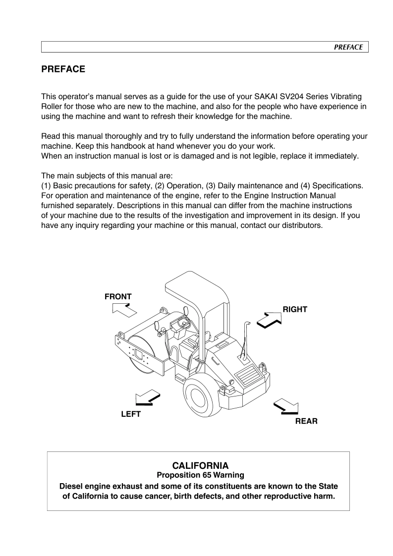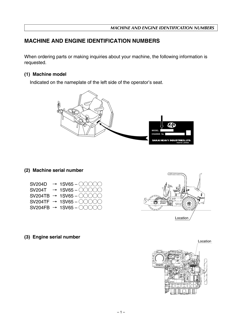 N0.3498-36540-4Read this handbook thoroughly and understand the whole informationcontained before trying to operate,inspect and service your machine!OPERATINGMAINTENANCEINSTRUCTIONSMODELSV204SeriesSV204DSV204TVIBRATINGSV204TBSV204TFROLLERSV204FBFrom SV204D→1SV65-30234SV204T→1SV65.30234SV204TB→1SV65-30234SV204TF→1SV65-30234SV204FB→1SV65-30234SAKAI