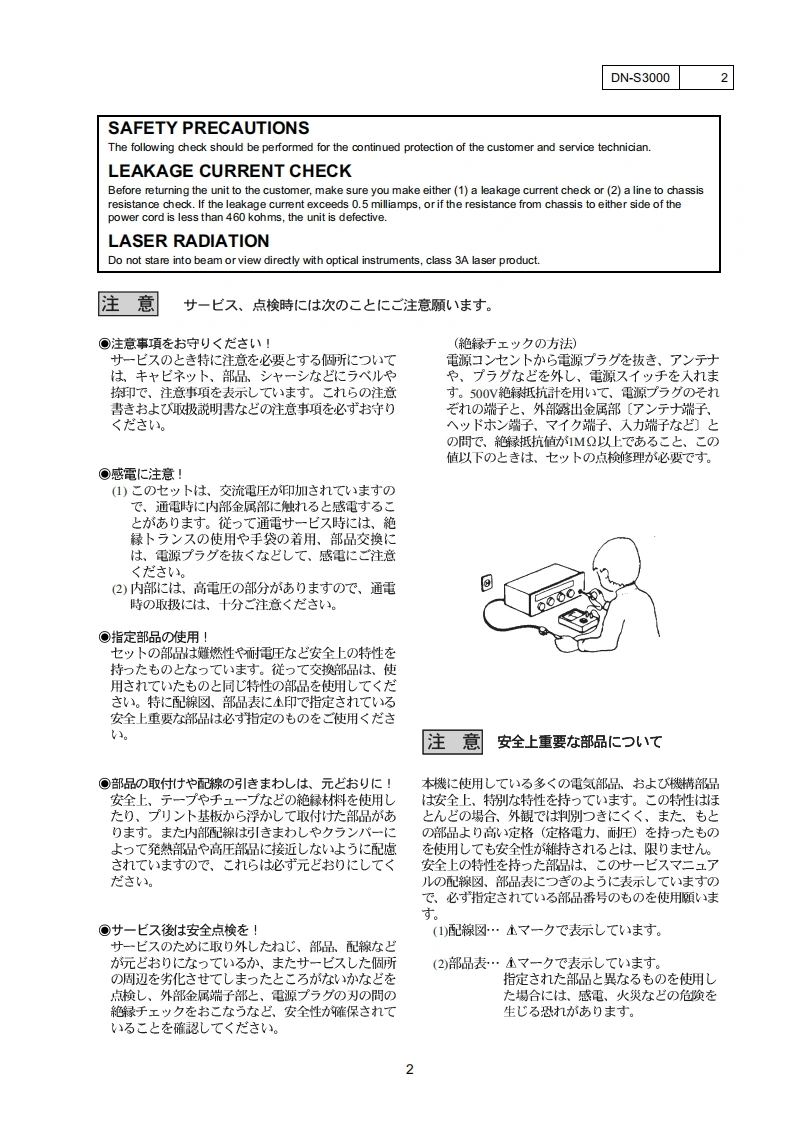 DENONFor U.S.A.,Canada,EuropeJapan modelSERVICE MANUALVer.1MODEL DN-S3000TABLE TOP SINGLE CD PLAYER注意廿一七又在方乙存前、乙)廿一上又又二1了儿左必式书読〈忙这。本機休、火災、感電、付法艺(亿对寸石安全性左確保寸石左协亿、志李志丰存配康在茄乙在一(方、丰龙法的「電氨用品安全法」屯七了老、所定)許可左得(製造这九又书)丰寸。徒(片一上又卷乙在際法、乙九5)安全性雏持九局大、乙)甘一上又又二工了无記载这九乙U八石注意事項在必式方守)〈龙。For purposes of improvement,specifications and·本機)仕横体性能改良)龙协、予告春〈变更寸石乙上design are subject to change without notice扩莎未寸。●補修用性能部品)保有期間体、製造打切後8年C寸。Please use this service manual with referring to the·修理)際体、必寸取极說明害左参照叨上、作業在行一operating instructions without fail.(《龙过。Some illustrations using in this service manual are·本文中使用L(L石亻与又卜体、說明)都合上现物slightly different from the actual set上多少異春局場合扩态)ま寸。DENON,Ltd.16-11,YUSHIMA 3-CHOME,BUNKYOU-KU,TOKYO 113-0034 JAPANX0180M.01DECD☑0308