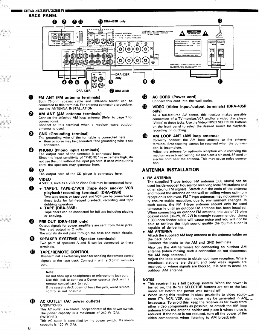 1DENONHi-Fi AM-FM Stereo ReceiverSERVICE MANUALFor U.S.A.ModelODEL DRA·435RSerial No.25551 and afterMODEL DRA·335RSerial No.38551 and afterAM-FM STEREO RECEIVERDRA-435RRC-129DRA-335RRC-129ATABLE OF CONTENTSOPERATING INSTRUCTIONS2-11REMOVALOF EACH SECTION............................................12,13METHOD OF ADJUSTMENTS14,15CONNECTION DIAGRAM OF MEASURING INSTRUMENTS....................16BLOCK/LEVELDIAGRAM(DRA-435R).........................................17BLOCK/LEVEL DIAGRAM(DRA-335R)17PARTS LIST OF EXPLODED VIEW............................................18EXPLODED VIEW OF CHASSIS AND CABINETNOTE ON PARTS LIST,,,,,,··20PRINTED WIRING BOARD PARTS LIST20-2PRINTED WIRING BOARD PATTERNS25271U-2345A MAIN UNIT (DRA-435R)251U-2344A MAIN UNIT (DRA-335R)61U-2346A MI-COM UNIT (DRA-435R/335R)21U-2347A TUNER UNIT(DRA-435R/335R)71U-2348A VIDEO UNIT (DRA-435R)27SEMICONDUCTORS.:…28,NIRING DIAGRAM·.·SCHEMATIC DIAGRAM(for DRA-435R)1SCHEMATIC DIAGRAM (for DRA-335R)32NIPPON COLUMBIA CO..LTD.
