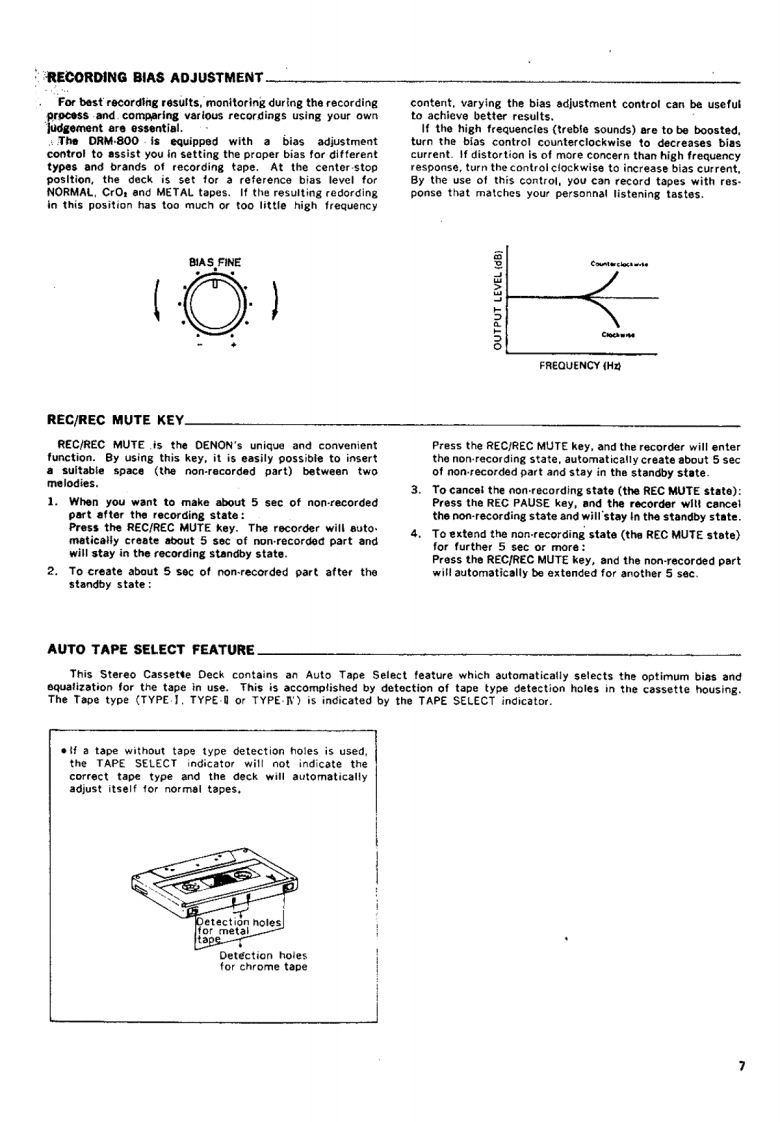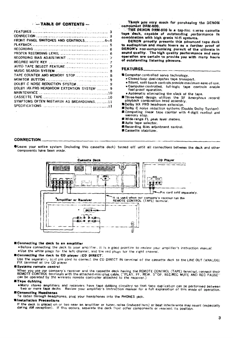 DENONHi-F ComponentSERVICE MANUALSTEREO CASSETTE TAPE DECKMODELDRM-800TABLE OF CONTENTSOPERATING INSTRUCTIONS............................................................211SPECIFICATIONS.....................................................................IBLOCK OlAGRAM..........................……12LEVEL DIAGRAM.,….13DISASSEMBLY INSTRUCTIONS.....................................................14-15ADJUSTING AND CHECKING THE MECHANISM SECTION..........................15-17ADJUSTING THE ELECTRCAL SECTIONS..........17-19PARTS LIST OF EXPLOPED VIEW.................………20EXPLODED VIEW OF CABINET AND CHASSIS GROUP...····21PARTS LiST OF 4U-1817/4U-1823/MECHANISM EXPLODED VIEW......................22EXPLODED VICW OF MECHANISM...、.....…23PARTS LIST OF 4U-1816..................................................24WNG0 AGRAM25SCHEMATIC DIAGRAM..........................26-27P.W.B0ARD0F4U-1816,.-8PW80A8D0F4U-1817f4U-1823.··……···…29SEMICONDUCTORS.........30NIPPON COLUMBIA CO.LTD