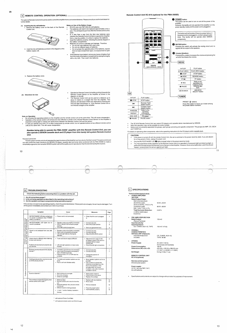 DENONHi-Fi Integrated Stereo AmplifierSERVICE MANUALMODEL PMA-35OSEINTEGRATED STEREO AMPLIFIERDENON胃-TABLE OF CONTENTS-OPERATING INSTRUCTIONS.........27REMOVAL OF EACH SECTION.8,9REMOVAL FOR SERVICING....................10METHOD OF ADJUSTMENTS......................11BLOCK AND LEVEL DIAGRAM........12SEMICONDUCTORS....................13-15PRINTED WIRING BOARD................16,17NOTE FOR PARTS LIST..............444418PARTS LIST OF P.W.BOARD........…18,19PARTS LIST OF EXPLODED VIEW..............20EXPLODED VIEW OF CHASSIS AND CABINET,,,,,.21SCHEMAT1C DIAGRAM.....23Some illustration using in this service manual is slightly different from the actual set.NIPPON COLUMBIA CO.,LTD