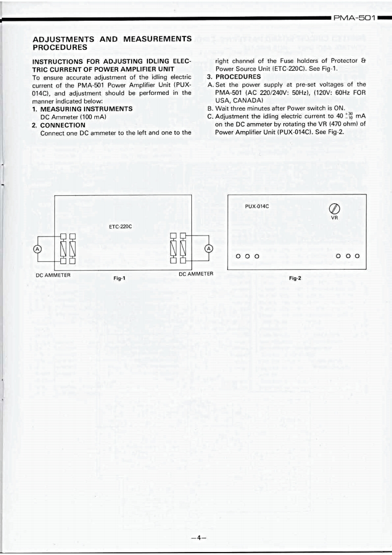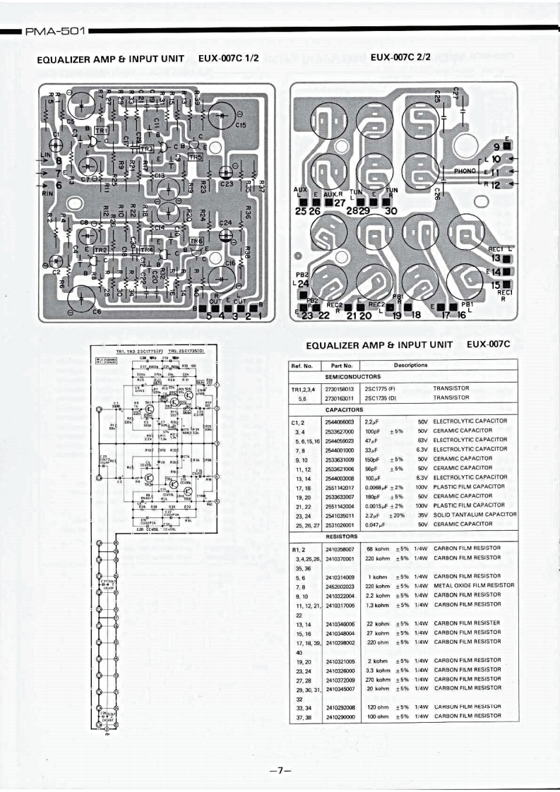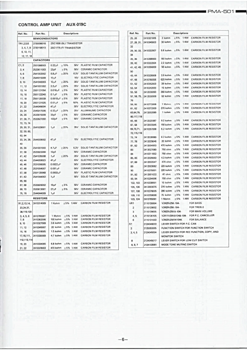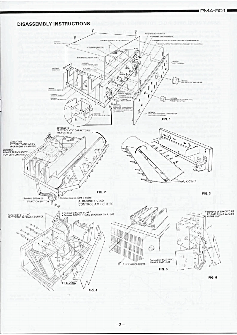 DENONHi-Fi Component/AmplifierSERVICE MANUALMODEL PMA-501SOLID STATE STEREOINTEGRATED AMPLIFIER止地个地1。t0卡ooTABLE OF CONTENTSSPECIFICATIONSBLOCK DIAGRAM...DISASSEMBLY INSTRUCTIONS....NEWLY DEVELOPED P.C.C.EQUIPMENT(Phono Crosstalk Canceller).........................3ADJUSTMENTS AND MEASUREMENTS PROCEDURES...................................4PRINTED CIRCUIT BOARD PATTERNS,CIRCUIT DIAGRAMS AND PARTS LIST ................5CONTROL AMP UNIT AUX-019C....……………………5EQUALIZER AMP AND INPUT UNIT EUX-007C.........................................7POWER AMP UNIT PUX-014C ....PROTECTOR AND POWER SOURCE UNIT ETC-220C....................................9WIRING DIAGRAM.................1011CHASSIS AND CABINET GROUP PARTS LIST..........................................14VOLTAGE CHANGEOVER..14NIPPON COLUMBIA CO.,LTD