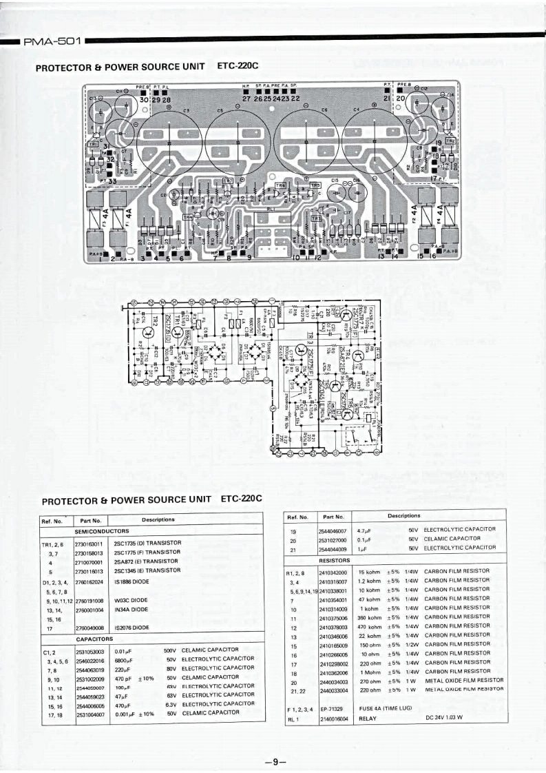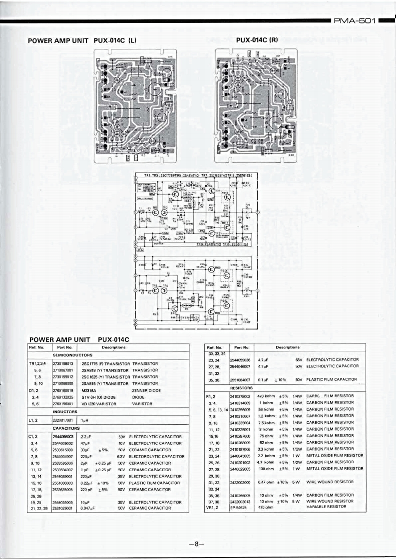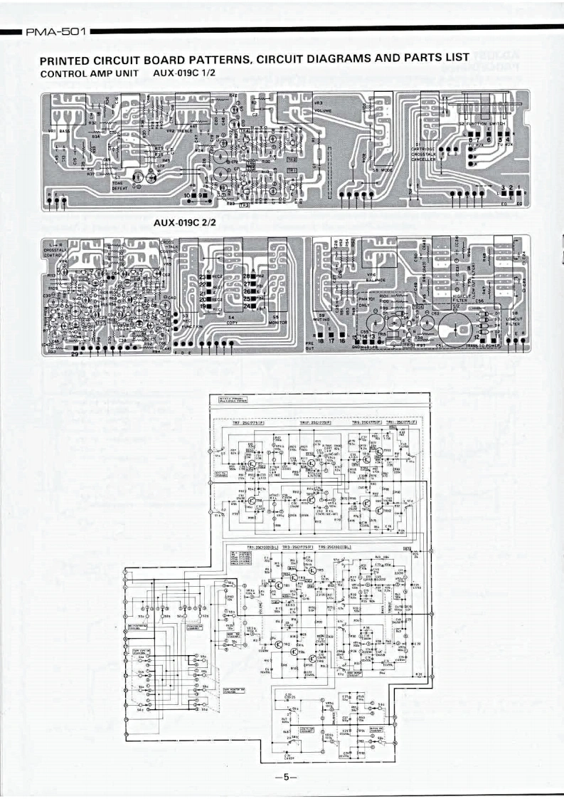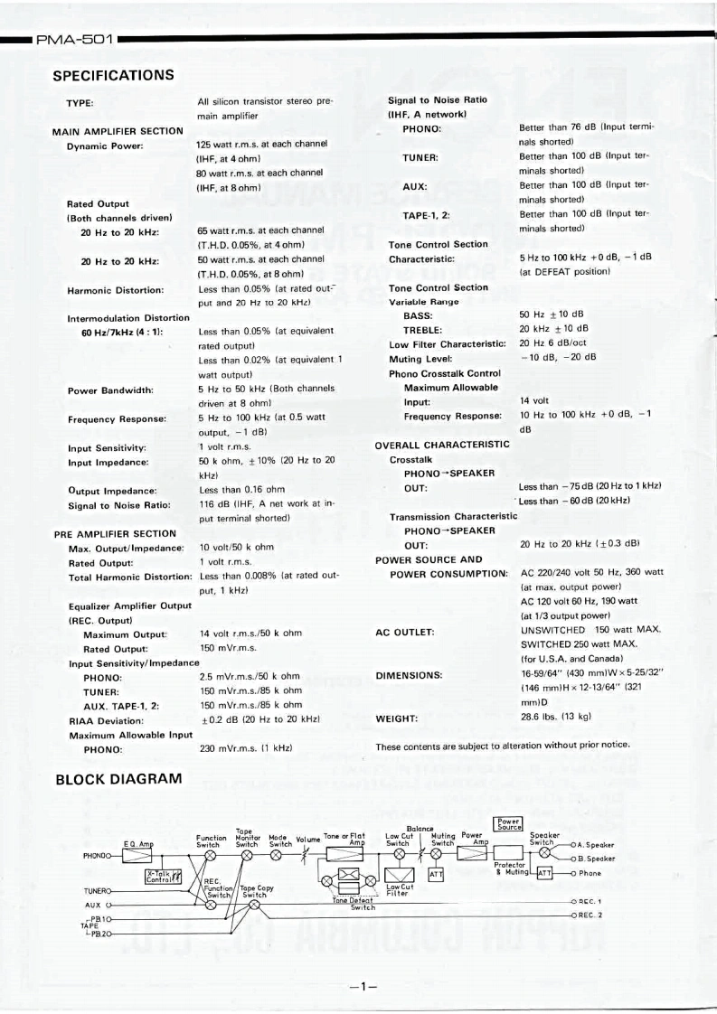 DENONHi-Fi Component/AmplifierSERVICE MANUALMODEL PMA-501SOLID STATE STEREOINTEGRATED AMPLIFIER止地个地1。t0卡ooTABLE OF CONTENTSSPECIFICATIONSBLOCK DIAGRAM...DISASSEMBLY INSTRUCTIONS....NEWLY DEVELOPED P.C.C.EQUIPMENT(Phono Crosstalk Canceller).........................3ADJUSTMENTS AND MEASUREMENTS PROCEDURES...................................4PRINTED CIRCUIT BOARD PATTERNS,CIRCUIT DIAGRAMS AND PARTS LIST ................5CONTROL AMP UNIT AUX-019C....……………………5EQUALIZER AMP AND INPUT UNIT EUX-007C.........................................7POWER AMP UNIT PUX-014C ....PROTECTOR AND POWER SOURCE UNIT ETC-220C....................................9WIRING DIAGRAM.................1011CHASSIS AND CABINET GROUP PARTS LIST..........................................14VOLTAGE CHANGEOVER..14NIPPON COLUMBIA CO.,LTD