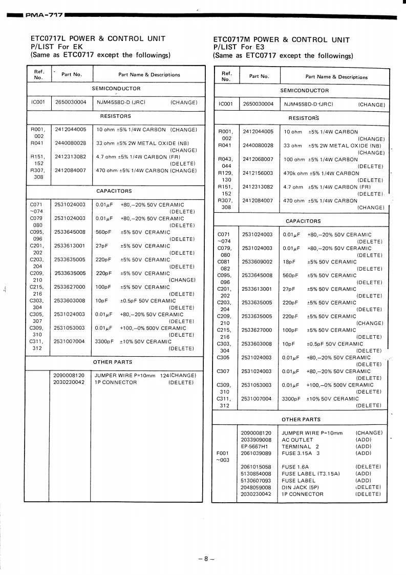 DENONHi-Fi Pre-Main AmplifierSERVICE MANUALMODEL PMA-717SOLID STATEPRE MAIN AMPLIFIERCONTENTSSPECIFICATIONSBLOCK DIAGRAM...............22DESIGNATION AND FUNCTIONS OF FRONT PANEL CONTROLS.....................CONNECTIONS............METHOD OF ADJUSTMENTSREMOVAL OF EACH SECTION ..PRINTED WIRING BOARD PATTERNS AND PARTS LISTETC0717 POWER CONTROL UNIT............................................6CONNECTION DIAGRAM.·8WIRING DIAGRAM.........................11SEMICONDUCTORS.........1EXPLODED VIEW OF CHASSIS AND CABINET P/LIST12NIPPON COLUMBIA CO,LTDAPR.198414