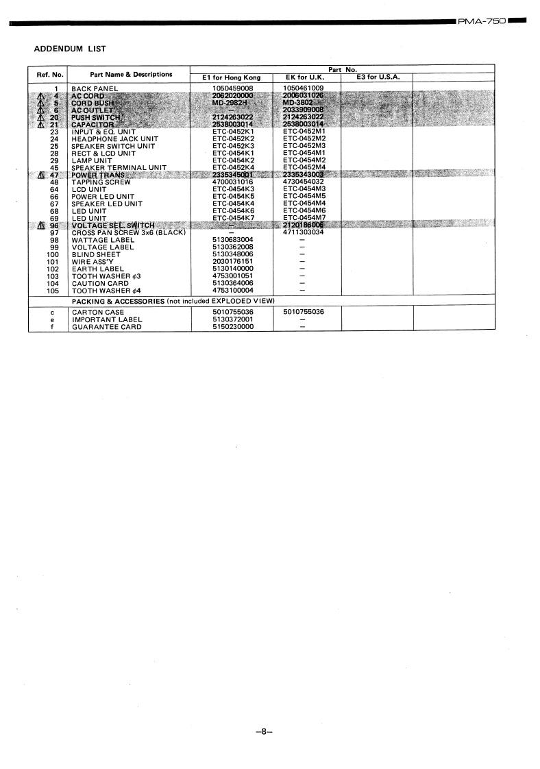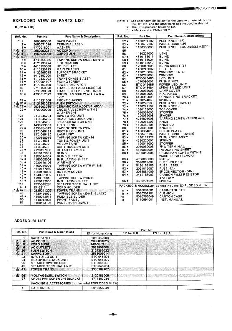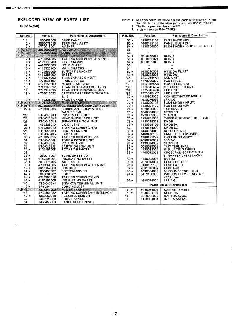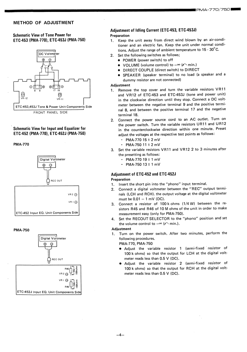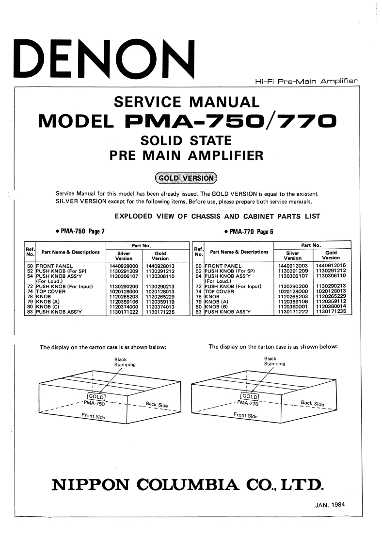 DENONHi-Fi Pre-Main AmplifierSERVICE MANUALMODEL PMA-77O/75▣SOLID STATEPRE MAIN AMPLIFIERPMA-770PMA-750CONTENTSSPECIFICATIONS,··,·,,······12BLOCK DIAGRAM,.····METHOD OF ADJUSTMENTS4EXPLODED VIEW OF CABINET CHASSIS6EXPLODED VIEW OF PARTS LIST ....68PRINTED CIRCUIT BOARD PATTERNS AND PARTS LISTT0NEEQ.UNIT ETC-453,453J...,..·,..:.,·,···912REC LCD UNIT ETC-454B,454K.................1314INPUT EQ.UNIT ETC-452B,452K15~18NIRING DIAGRAM·,,,,·,,,,··········20,21CONNECTION DIAGRUM,.,·.·...19,21NIPPON COLUMBIA CO.,LTD.