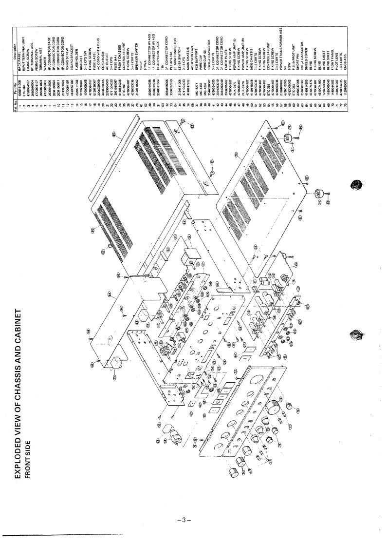 DENONHi-Fi Component AmplifierSERVICE MANUALMODEL PMA-850SOLID STATE STEREOINTEGRATED AMPLIFIERTABLE OF CONTENTSSPECIFICATIONS.......................BLOCK DIAGRAM...METHOD OF ADJUSTMENTS.22EXPLODED VIEW OF CHASSIS AND CABINETFRONT SIDE..,…3BACK SIDE..PRINTED CIRCUIT BOARD PATTERNS AND PARTS LISTINPUT TERMINAL UNIT ETC-261.....,,,..·...·....···...··..·5CONTROL (A)UNIT ETC-259-1,-2,-3.CONTROL(B)UNIT ETC-260 ..58POWER AMP UNIT PUX-017B-L,-R...POWER SWITCH PROTECTOR UNIT ETC-262.…10……12CHASSIS AND CABINET GROUP PARTS LIST...............................16VIRING DIAGRAM...··.·15NIPPON COLUMBIA CO..LTD.
