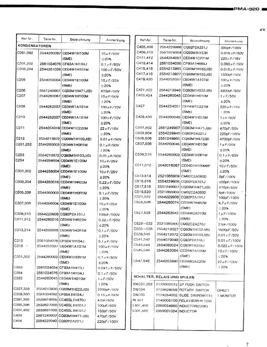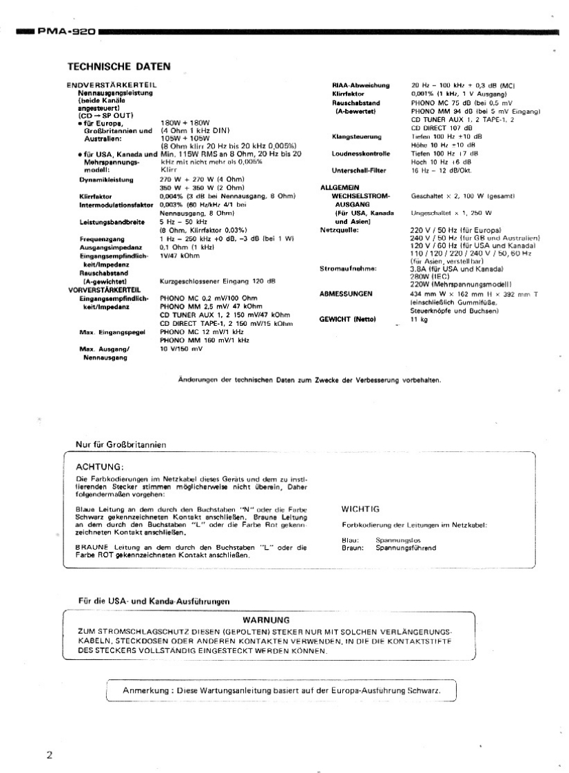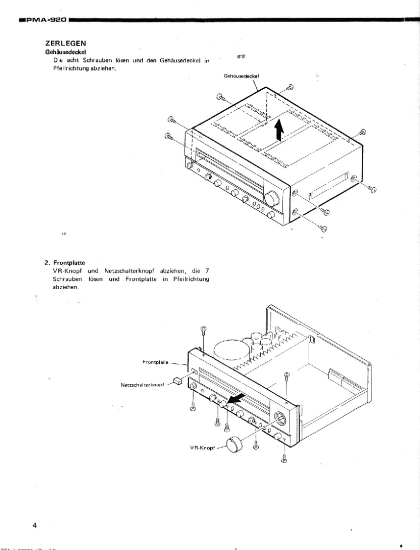 DENONIntegrierter Hi-Fi-StereoverstarkerWARTUNGSANLEITUNGTYPPMA-920INTEGRIERTER STEREOVERSTARKERINHALTTECHNISCHE DATEN·,···ANSCHLUSSE3ZERLEGEN........EINSTELLUNG5BLOCKSCHALTBILD5HALBLEITER..6TEILELISTE DER PLATINE·····.·······7.8PLATINENETZTEIL-UND KLANGREGELBAUGRUPPE KU-9138{Europa austuhrung).,,,····NETZTEIL-UND KLANGREGELBAUGRUPPE KU-9141(Ausfuhrung fur USA und Kanada)10ENDSTUFENBAUGRUPPE KU-913711ANSCHLUSSDIAGRAMM.,,...,,,,,,,.·.·12SCHALTPLAN..13EXPLOSIONSZEICHNUNG VON CHASSIS UND GEHAUSE UND TEILELISTE ..............14ZUSATZLISTE.·.··15NIPPON COLUMBIA CO.LTD.